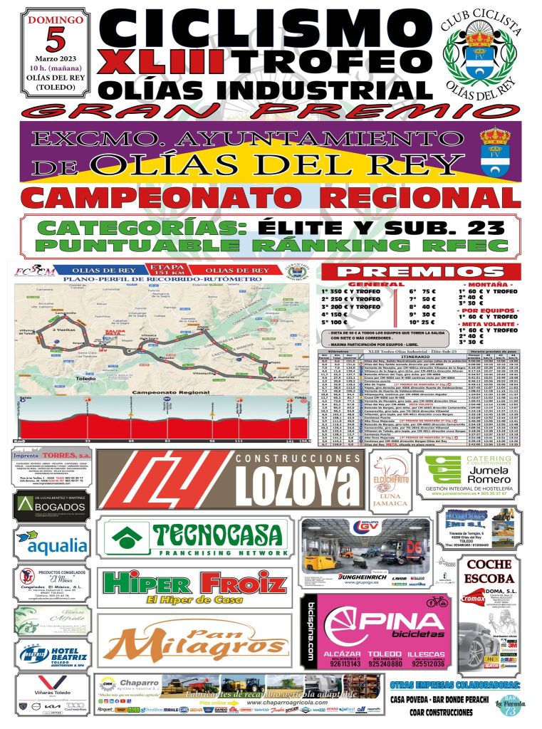El Campeonato de Castilla-La Mancha de carretera élite y sub23 2023 se disputará este domingo 5 de marzo de nuevo en la localidad toledana de Olías del Rey y enmarcado por el Trofeo Olías Industrial, convertido ya en una de las clásicas del calendario regional tras sumar 43 ediciones ininterrumpidas. La carrera, organizada por el Club Ciclista Olías del Rey, es puntuable para el ranking de la RFEC.