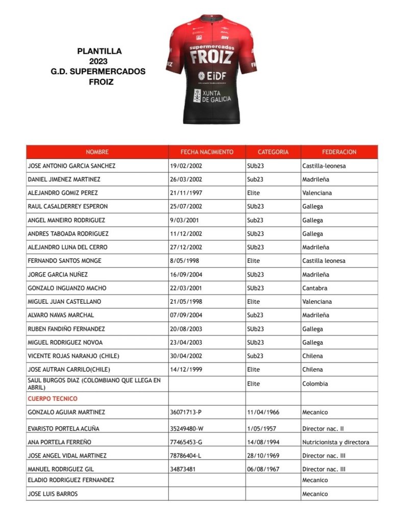El equipo ciclista Súper Froiz ha presentado hoy a su equipo de carretera para la temporada 2023. El acto tuvo lugar en el precioso pueblo gallego de Combarro con la presencia de todos los patrocinadores. La plantilla del club pontevedrés cuenta en sus filas con los ciclistas alicantinos Miguel Juan y Alejandro Gómiz, que ya vistió dicho maillot en 2022. El alteano competirá el domingo en el Trofeo Guerrita, mientras que el almoradidense se pondrá en el dorsal en la doble cita de Toledo: El sábado, en Burguillos, y, el domingo, en Olías del Rey.