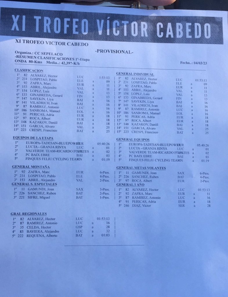 Héctor Álvarez (Lucta Granja Rinya) ha sido el ganador del XII Trofeo Castillo de Onda, prueba inaugural del XI Trofeo Víctor Cabedo 2023 disputada hoy. El benidormense se viste de líder tras parar el reloj en la hora, 53 minutos y 13 segundos. Pablo Lopistao ha entrado a continuación, a 9 segundos, y Marc Zafra, a 11″, ha completado el podio. Novena plaza para Antonio Ramírez (Lucta). Marc Zafra es el líder de la montaña; Joan Gamundi (Saxun), de las Metas Volantes; y el Europa Tadesan, la mejor escuadra.