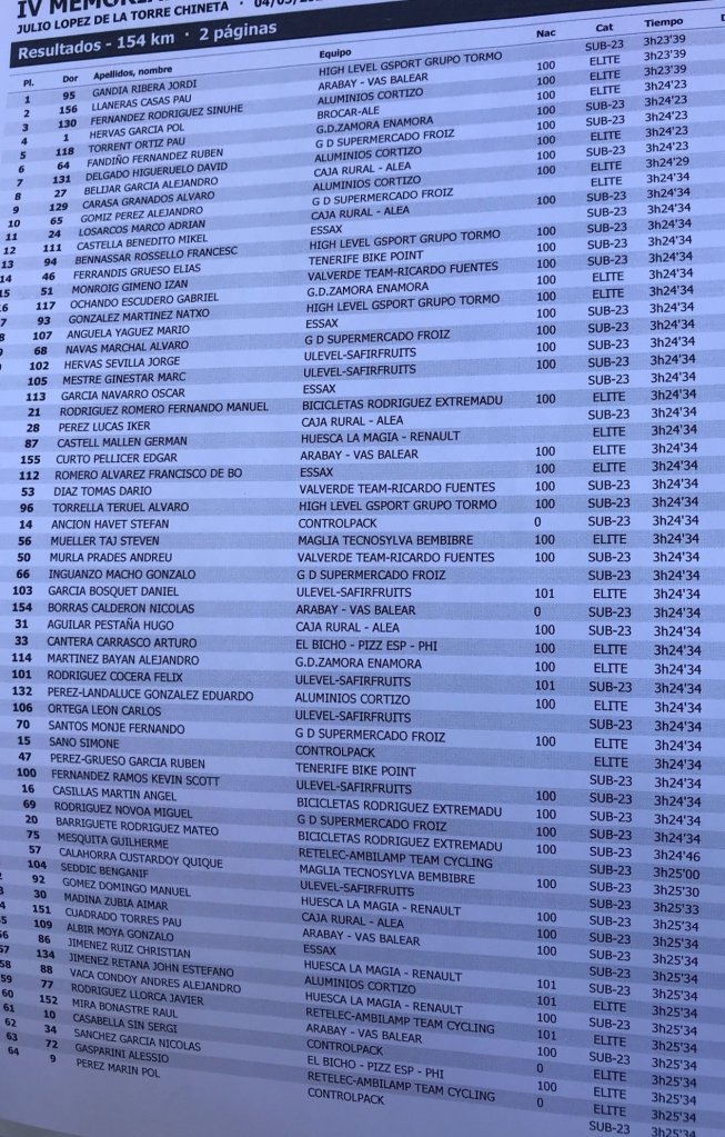 Jordi Gandía (High Level Gsport) se ha impuesto esta mañana en el IV Memorial Julio López de la Torre ‘Chineta’ para corredores élite y sub 23 disputado en Burguillos. Gandía ha superado al esprint a Pau Llaneras (Arabay) y Sibuhé Hernández (Cortizo), que han parado el reloj en tres horas, 23 minutos y 39 segundos. Pol Hervás (Brocar Alé) ha sido cuarto. Décima plaza para Alejandro Gómiz (Froiz). En el puesto 12 ha entrado Mikel Castella (Essax); en el 18, Mario Anguela (Essax).