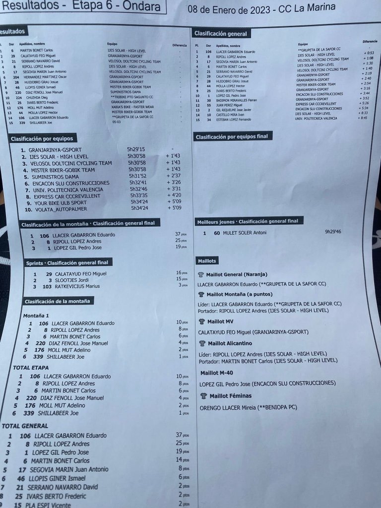 Eduardo Llacer lleva también el maillot de la montaña; Miguel Calatayud, el de las Metas Volantes; Andrés Ripoll, el de primer alicantino; Pedro José López, el de M40; y, Mireia Orengo, el de la primera féminas.