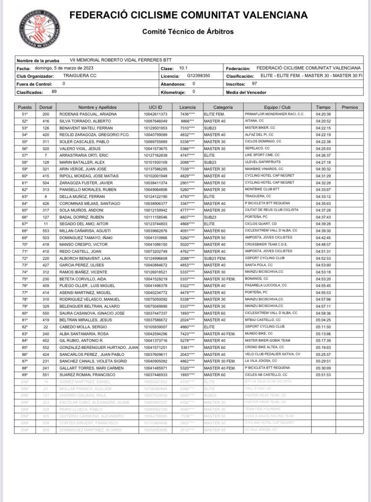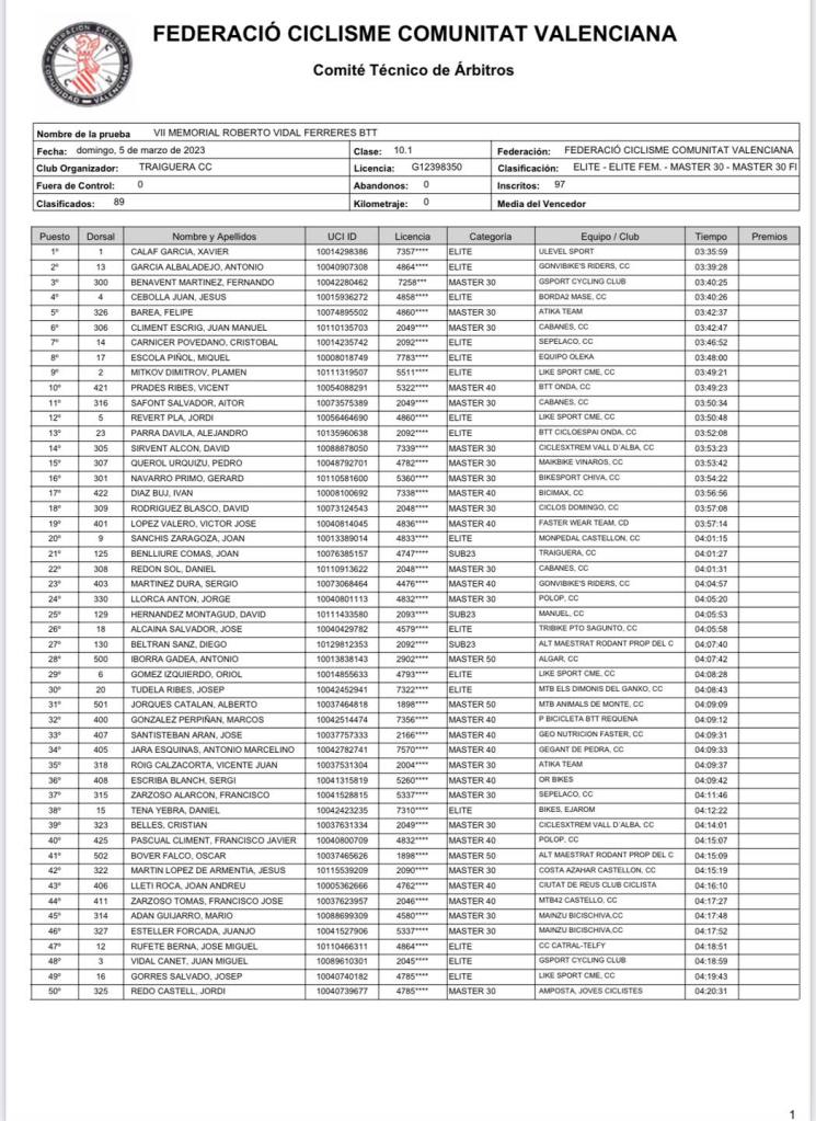 Xavi Calaf (Ulevel S`port) y Ariadna Ródenas han sido hoy en Traiguera vencedores de la primera prueba puntuable del OPEN BTT XCM de la Comunidad Valenciana. En la séptima edición del Memorial BTT Roberto Vidal Ferreres, Calaf ha estado acompañado en el podio por Antonio García (Gonvibike’s) y Jesús Cebolla (Borda2). La ilicitana ha tenido a su lado en los cajones a Laia Alborch (Gsport Cycling) y Aida Beteta (Bonanos). Calaf y Ródenas hab sido también los primeros élites. Joan Benlliure (Traiguera) y Alborch han vencido en sub 23.