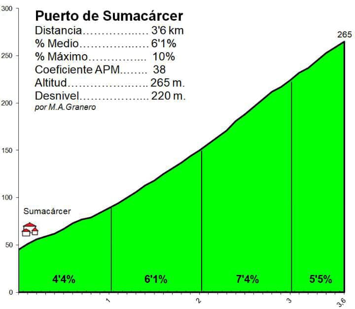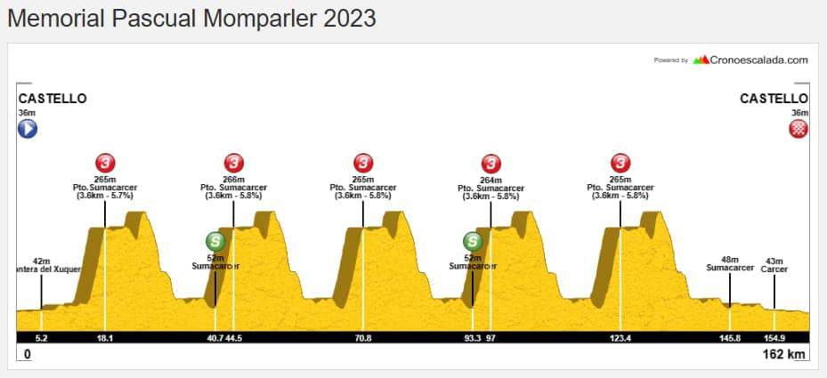 El Memorial Pascual Momparler 2023 estrenara recorrido. La prueba de la Copa de España Élite y Sub 23 contará con 162 kilómetros y discurrirá en un circuito, modelo mundialista, en la que se deberán ascender nada menos que en cinco ocasiones el puerto de Sumacárcer, de 3,6 Km. y una pendiente media del 6,1%. La bajada es muy técnica. La prueba tendrá lugar el 14 de mayo, a partir de las 9.30 horas.