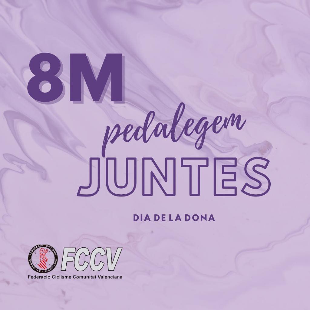 Con motivo del 8M, Día Internacional de las mujeres, la Federación de Ciclismo de la Comunidad Valenciana (FCCV) hace una llamada a todas las féminas a realizar un vídeo diciendo el nombre del equipo, club o grupeta y una frase de apoyo. Por ejemplo: Nosotras pedaleamos por la igualdad. También a realizar fotos de salidas conjuntas o en solitario y subirlas a las redes sociales etiquetadas con el @federaciociclisme_cv De esta manera, se quiere dar a conocer en sentir de todo el ciclismo femenino de la Comunitat Valenciana. Además, de esta manera, podrán formar parte del vídeo resumen que hará la Federación entre todas las fotos que lleguen al correo: dones@fccv.es