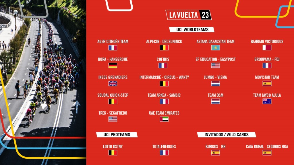 Los equipos Lotto Dstny (BEL) y TotalEnergies (FRA), los dos mejores UCI ProTeams en el ranking UCI de 2022, también participarán en La Vuelta 23. Además organización de La Vuelta ha otorgado una invitación a las siguientes formaciones: Burgos-BH (ESP) Caja Rural-Seguros RGA (ESP).