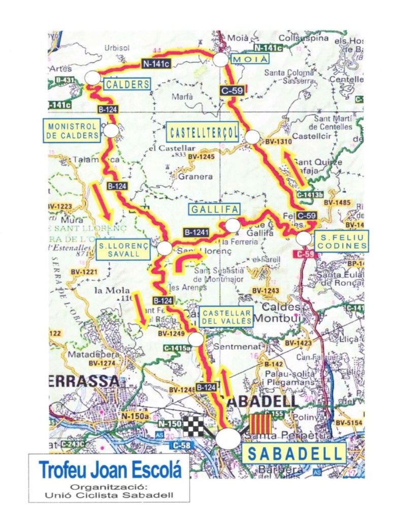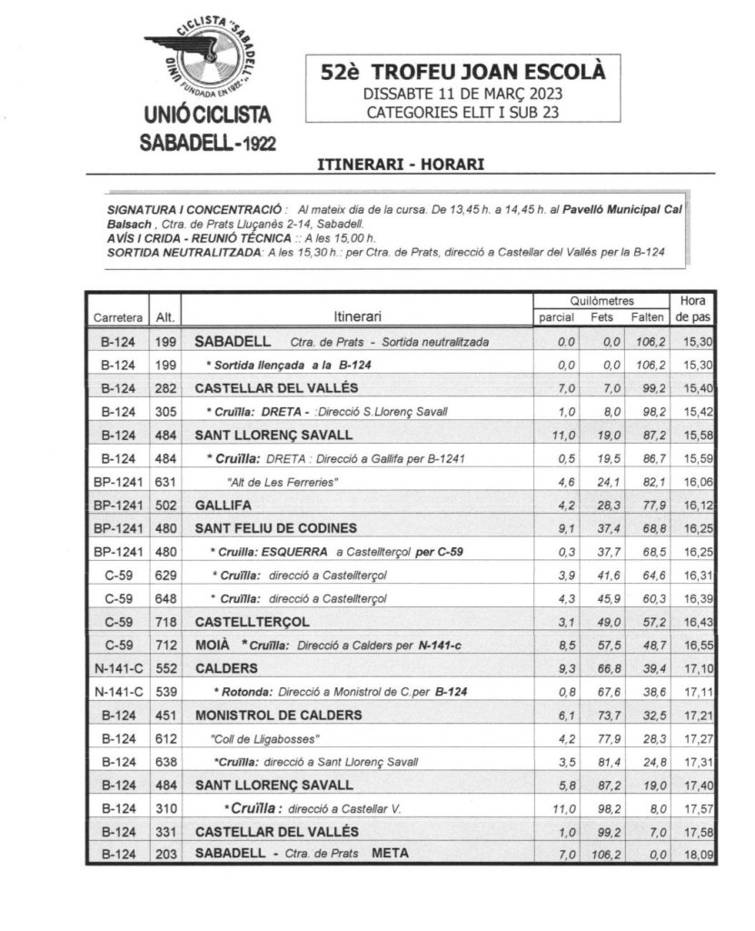 La tarde del sábado 11 de marzo será el turno del 52º Trofeo Joan Escolà , que tendrá un recorrido de 106,2 kilómetros con salida y llegada frente al Pabellón Municipal de Cal Balsach con un desnivel acumulado de 1.320m, empezando con la dificultad del ‘Alto de las Ferrerías para continuar por Gallifa, Castellterçol, Moià, Calders, Monistrol de Calders, el Coll de Lligabosses, Sant Llorenç Savall y Castellar del Vallès.