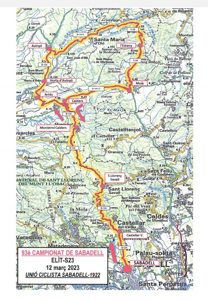 Por su parte, como es habitual, la matinal del domingo 12 de marzo se repetirá ubicación con el 93 Campeonato de Sabadell , la segunda prueba de la historia del calendario ciclista catalán con más ediciones disputadas después de la Vuelta Ciclista a Cataluña, que añadirá aún más dureza con un recorrido de 130,8 kilómetros y más de 1.600 metros de desnivel acumulado, con el ascenso de inicio al Collet de Lligabosses, para después dirigirse a Monistrol de Calders, Calders, Artés, Aviñón, Raval de la Rovirola, L’Estany, Moià y vuelta por Calders, Monistrol y un ascenso final a Lligabosses para volver a Sabadell por Sant Llorenç Savall y Castellar del Vallès.