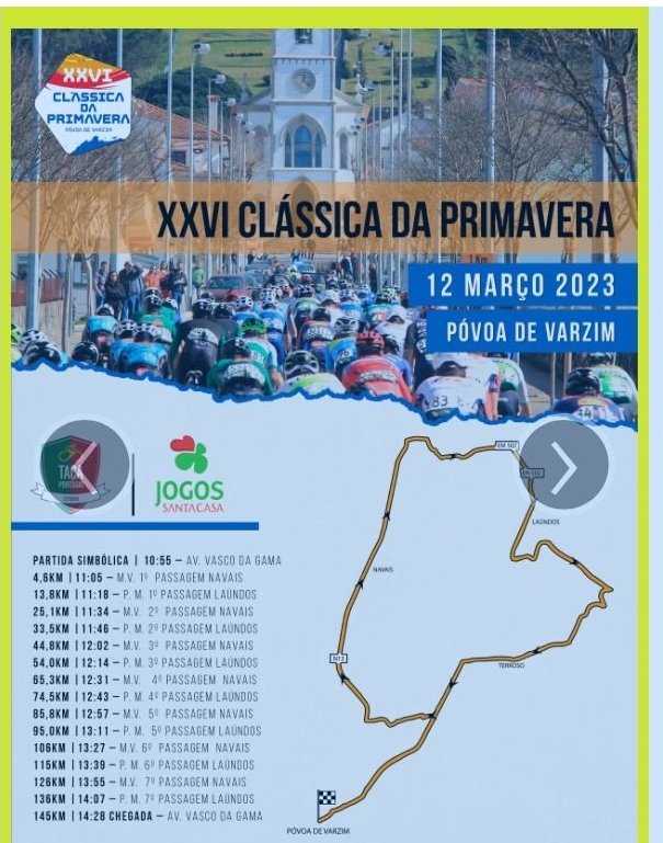Miguel Juan se desplaza hasta la ciudad portuguesa de Póvoa de Varzin para disputar este domingo, día 12 de marzo, con el equipo Froiz, la XXVI Clássica da Primavera junto a las escuadras profesionales del país luso. La prueba cuenta con 145 kilómetros de recorrido y el pelotón partirá a las 10.55 desde la Avenida Vasco de Gama de la localidad lusa. Miguel Juan llega ya recuperado de las secuelas de un Covid que no le dejó rendir al máximo en el Trofeo Guerrita.