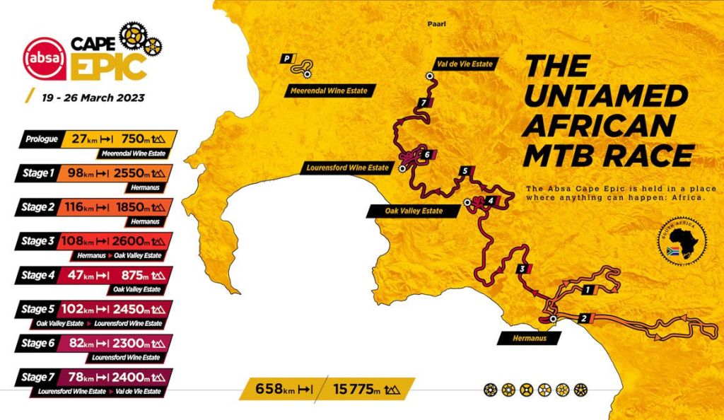 Del 19 al 26 de marzo, Sudáfrica será el centro de atención del mountain bike mundial con la celebración de la Absa Cape Epic 2023. Considerada como el Tour de Francia del MTB, la Cape Epic será un año más la mejor carrera de XCM por etapas del año y su lista de favoritos no deja lugar a dudas. Recorrerá 658 kilómetros, con 15.775 metros de desnivel acumulado a lo largo de sus 8 días de carrera, que no se parecen a ninguna edición anterior.