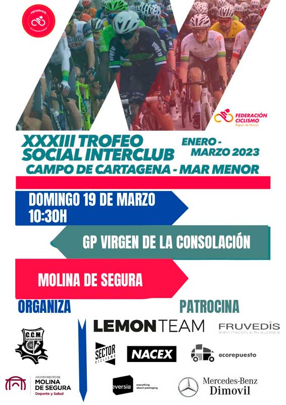 El domingo, día 19 de marzo, a las 10.30 horas, en Molina de Segura, se celebra el 63º Gran Premio Virgen de la Consolación, una prueba ciclista que se disputará recorriendo el casco urbano del municipio, organizada por el Club Ciclista Molinense y el Ayuntamiento de Molina de Segura, en colaboración con la Federación de Ciclismo de la Región de Murcia. Consta de un circuito de 4,5 km al que se le darán 15 vueltas, siendo la primera neutralizada. Será la última jornada del XXXIII Trofeo Social Interclub Campo de Cartagena–Mar Menor. La general está que arde y entre el líder, Teo Jiménez, y el segundo clasificado, Ismael Sánchez, sólo hay 43 segundos de diferencia. La emoción está asegurada. Teófilo Jiménez (Ciclos Teo) lleva también el maillot de las Metas Volantes e Ismael Sánchez (33 Bike), el de la Montaña.