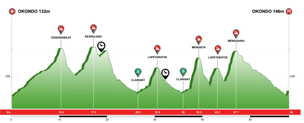 Etapa con una gran exigencia, más de 1000 metros de desnivel, en forma de 6 pasos de montaña (2 de 3ª categoría, 3 de 2ª y el temible paso de Mendieta de 1ª). Esta jornada clarificará la General, pero quien se haya descolgado en la última ascensión dispone de 11 kilómetros favorables para lograr empalmar antes de llegar a la meta de Okondo.
