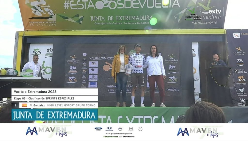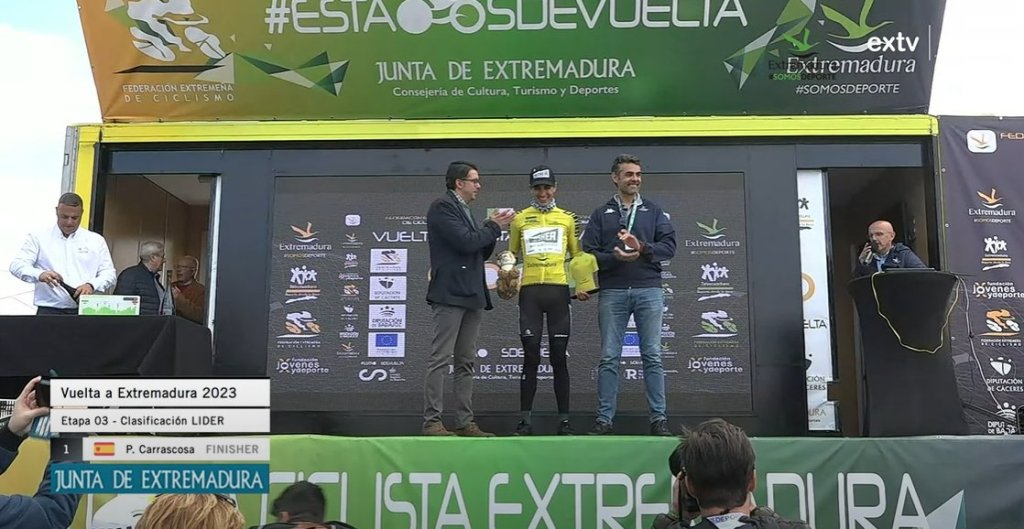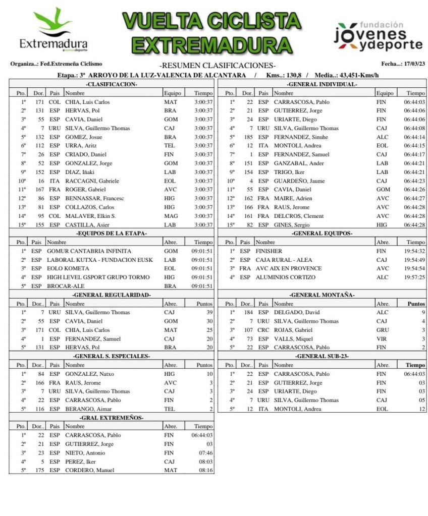Luis Carlos Chia (Matdiver) se ha impuesto al esprint en la tercera etapa de la Vuelta Ciclista a Extremadura para corredores élites y sub 23. La jornada ha llevado al pelotón de Arroyo de la Luz a Valencia de Alcántara, tras 130,8 kilómetros de recorrido. En la recta final ha existido una caída por una imprudencia de un aficionado. Segunda plaza para Pol Hervás (Brocar Alé) y quinta para su compañero Josué Gómez. Una pena. Gran trabajo del equipo alcoyano.