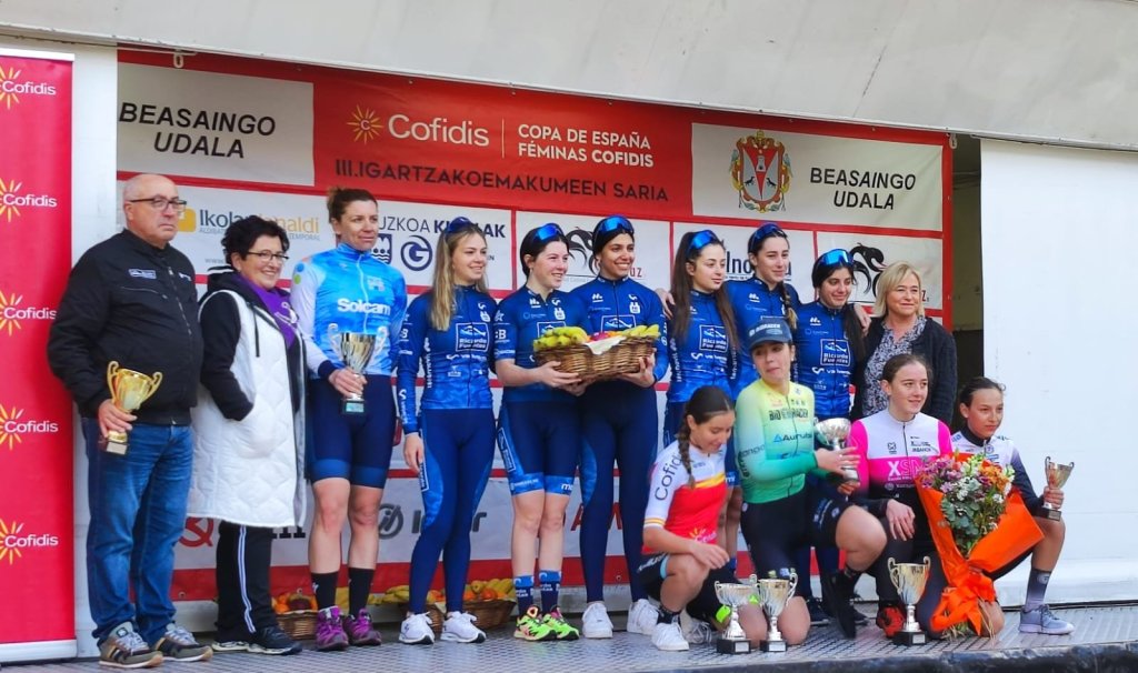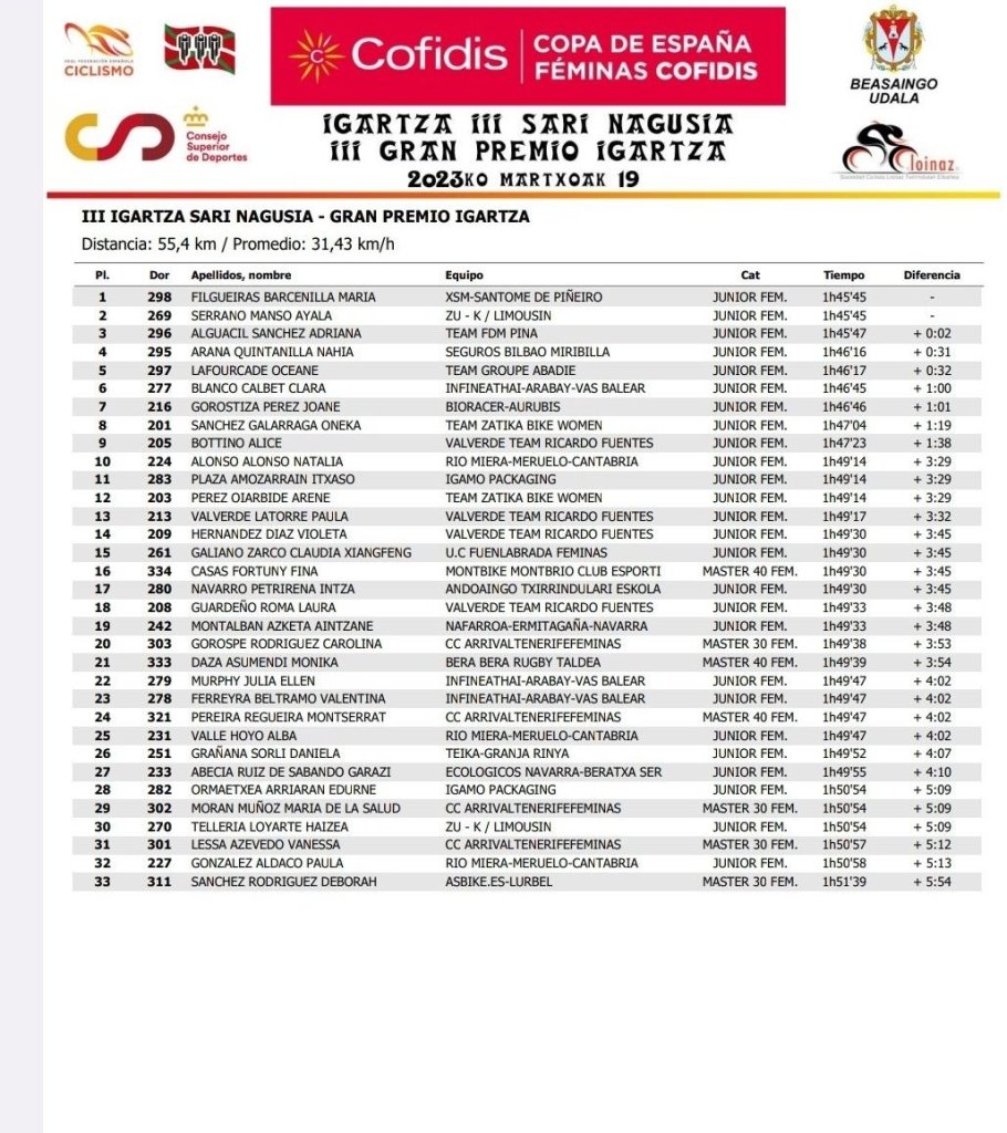 Victoria para María Filgueiras en Beasain en categoría júnior en la Copa de España de Féminas. La gallega se ha impuesto al sprint a Ayala Serrano, que es la nueva líder, y a Ariadna Alguacil. Puesto 15 para Claudia Xiangfeng Galiano (Fuenlabrada) y 18 para Laura Guardeño (Valverde Team), que ha subido al podio con sus compañeras para recibir el premio de mejor escuadra.
