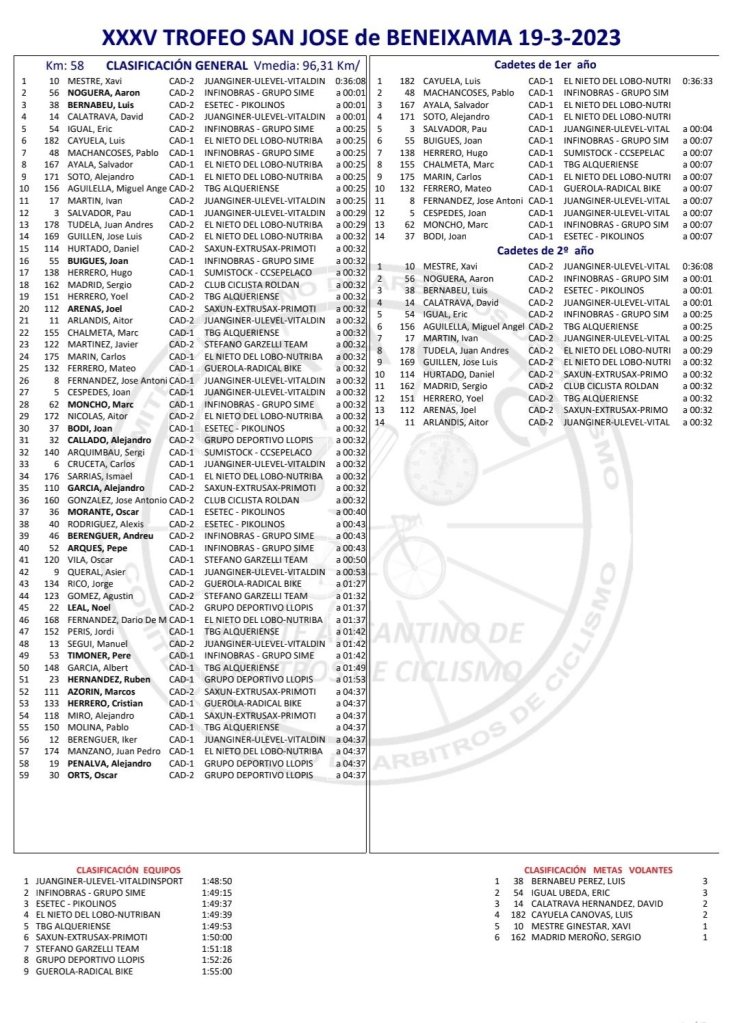 Xavi Mestre (Juan Giner Ulevel Vitaldinsport) se ha impuesto hoy en Beneixama en la XXXV Carrera Ciclista de Sant Josep. En la primera prueba cadete de la Comunidad de la temporada 2023 también han subido al podio Aarón Noguera (Infinobras-Grupo Sime) y Luis Bernabéu (Esetec Pikolinos), como segundo y tercero, respectivamente. El JuanGiner ha sido la mejor escuadra y Bernabéu se ha llevado las Metas Volantes.