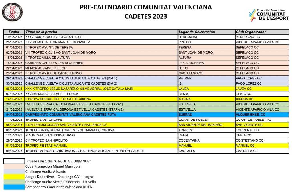 La Federación de Ciclismo de la Comunitat Valenciana ya ha hecho oficial el pre-calendario de la temporada 2023 de la categoría cadete. Existen 23 pruebas confirmadas y con fecha asignada pertenecientes a la Copa Promoción Miguel Manrubia, Challenge Vuelta Ciclista Alicante, Challenge Vuelta Sierra Calderona, Juegos Deportivos-Challenge Itegra-Comunitat Valenciana, además de numerosas pruebas de un día en circuitos urbanos . El Campeonato Autonómico cadete de ruta se celebrará el 4 de junio en Sueras, organizado por el Sport Ciclista Alqueriense, y contará con 53 kilómetros.
