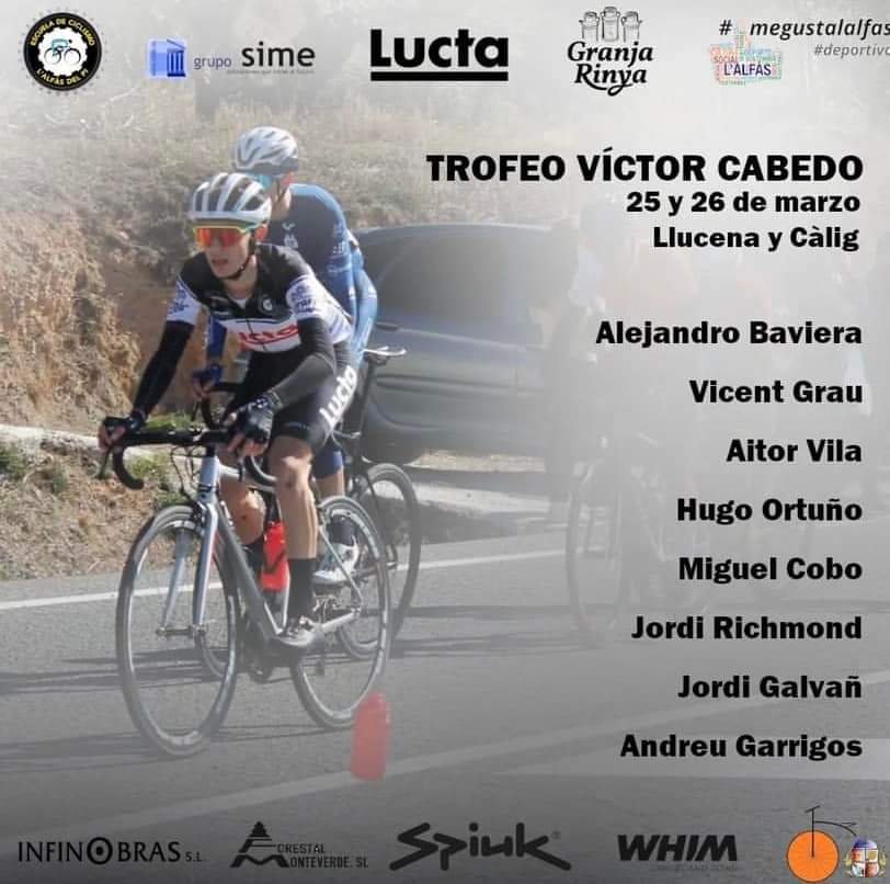 Llucena y Càlig pondrá este fin de semana el punto y final al Trofeo Víctor Cabedo 2023 que lidera Pablo Lospitao (Electromercantil-GR100) tras la disputa de las prueba de Onda y Segorbe. La principal baja de la prueba será la de Héctor Álvarez (Lucta-Granja Rinya), ganador de la primera jornada, que va a competir con la FCCV en Mallorca en el Campeonato de España de Omnium y Madison. Mario Álvarez también está en dicha competición. La escuadra de Alfaz del Pi competirá con Vicent Grau, Aitor Vila, Alejandro Baviera, Jordi Ritchmond, Jordi Galvañ, Miguel Cobo, Andreu Garrigós y Hugo Ortuño.