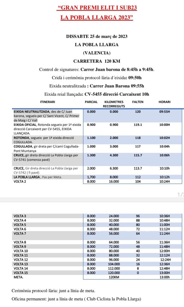 El sábado, día 25 de marzo, se disputará el Gran Premi La Pobla Llarga para corredores élites y sub 23 y puntuable para la Challenge de la Comunitat Valenciana. La salida está fijada a las 10 horas y el pelotón deberá recorrer 120 kilómetros, de los que 30 serán de pavé. Desde el 2003 no se había hecho una carrera elite en la localidad valenciana. La organización corre a cargo del Club Ciclista La Pobla Llarga.