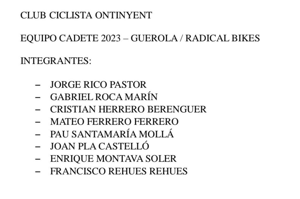 La escuadra cadete, denominada Guerola-Radical Bikes, cuenta con ocho integrantes, y figuran como técnicos Elu Mancebo y Juan Salmerón. La plantilla está formada por Jorge Rico, Gabriel Roca, Cristian Herrero, Mateo Ferrero, Pau Santamaría, Joan Pla, Enrique Montava y Francisco Rehues.