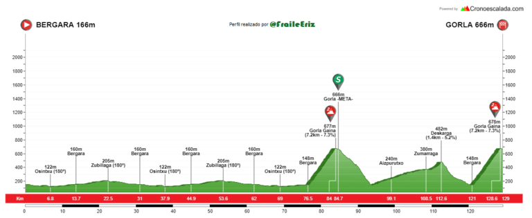Final en alto en la prueba del Torneo Euskaldún del domingo, que tendrá lugar en Gorla. Un trazado con 129 kilómetros que contará con 3 complicaciones montañosas, donde el Alto de Gorla, donde concluirá la etapa, será el principal atractivo del día con una ascensión de 7 kilómetros sin un metro de bajada. La pendiente siempre rondará el 8% y alcanzará el 10% en la última parte de la subida, lugar idóneo para cambiar el ritmo si tienes un gramo de fuerza.