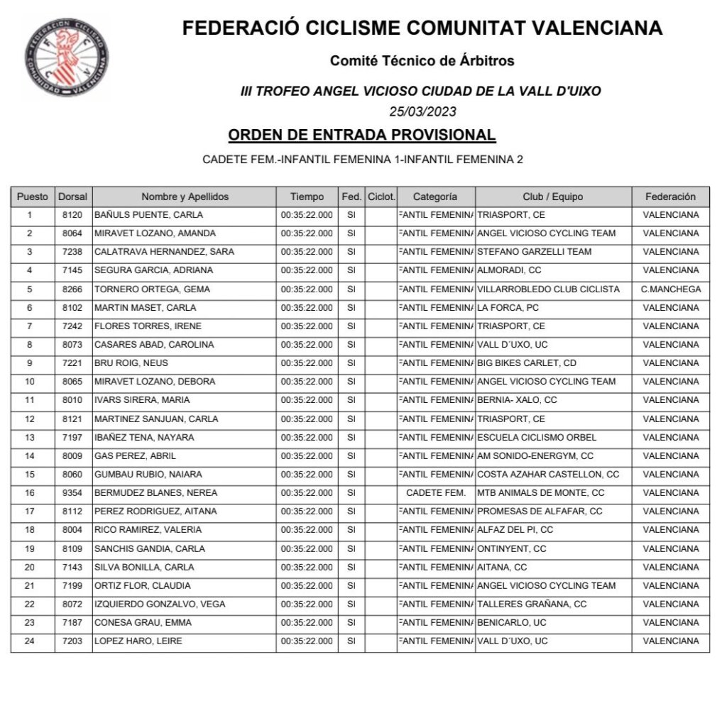 El sábado se inició en Vall d’Uixó la Challenge de Escuelas de las Provincia de Castellón con la disputa del III Trofeo Ángel Vicioso-Gran Premio Cosaor. Dicha prueba también dio el banderazo de salida a la Liga de Féminas de la Comunidad en la que compiten sólo las niñas. En la primera prueba se dieron cita 32 alevines y 28 infantiles, lo que fue todo un éxito. Hay previstas otras cinco carreras con esta característica que se disputaran en La Vila (20 de mayo), Alfafar (4 de junio), San Vicente (10 de junio), Belrreguard (26 de agosto) y Villafranca (3 de septiembre).