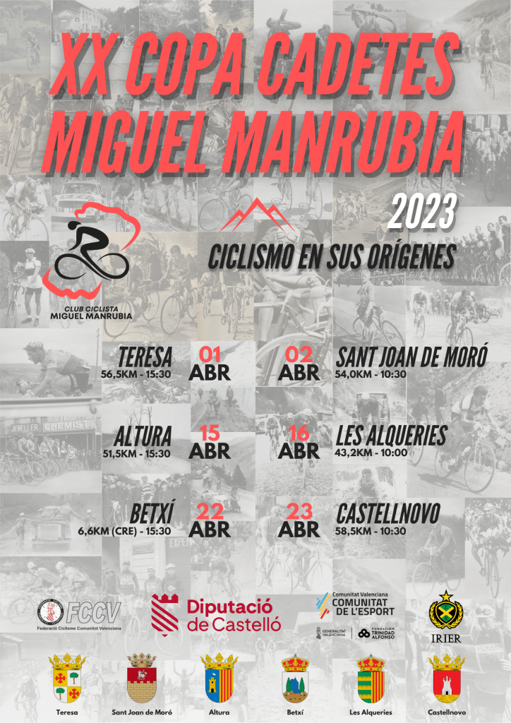 El mes de abril será sinónimo de ciclismo cadete en la provincia de Castelló, con la disputa de la Copa Cadete Miguel Manrubia y sus seis pruebas repartidas en los fines de semana de los días 1, 2, 15, 16, 22 y 23. Las localidades de Teresa, Sant Joan de Moró, Altura, Alqueries, Betxi y Castellnovo serán las encargadas de acoger las pruebas puntuables de un certamen en el que habrá una general final y que tiene prevista la participación de los mejores cadetes a nivel nacional.