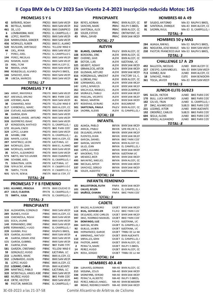 - Categorías: Promesas 7 y 8 Fem., Promesas 7 y 8, Promesas 5 y 6 Fem., Promesas 5 y 6, Principiante Fem., Principiante, Mujeres PRO 17, Mujeres de 50 y mas, Mujeres de 40 a 49, Mujeres de 30 a 39, Mujeres de 13 a 16, Master 50 y mas fem, Master 50 y mas, Master 40 fem., Master 40, Master 30 fem., Master 30, Junior fem., Junior, Infantil fem., Infantil, Hombres PRO 17, Hombres de 50 y mas, Hombres de 40 a 49, Hombres de 30 a 39, Hombres de 13 a 16, Elite-Sub23 Fem., Elite-Sub23, Challenge 17 a 29 Fem., Challenge 17 a 29, Cadete fem., Cadete, Alevin Fem., Alevin