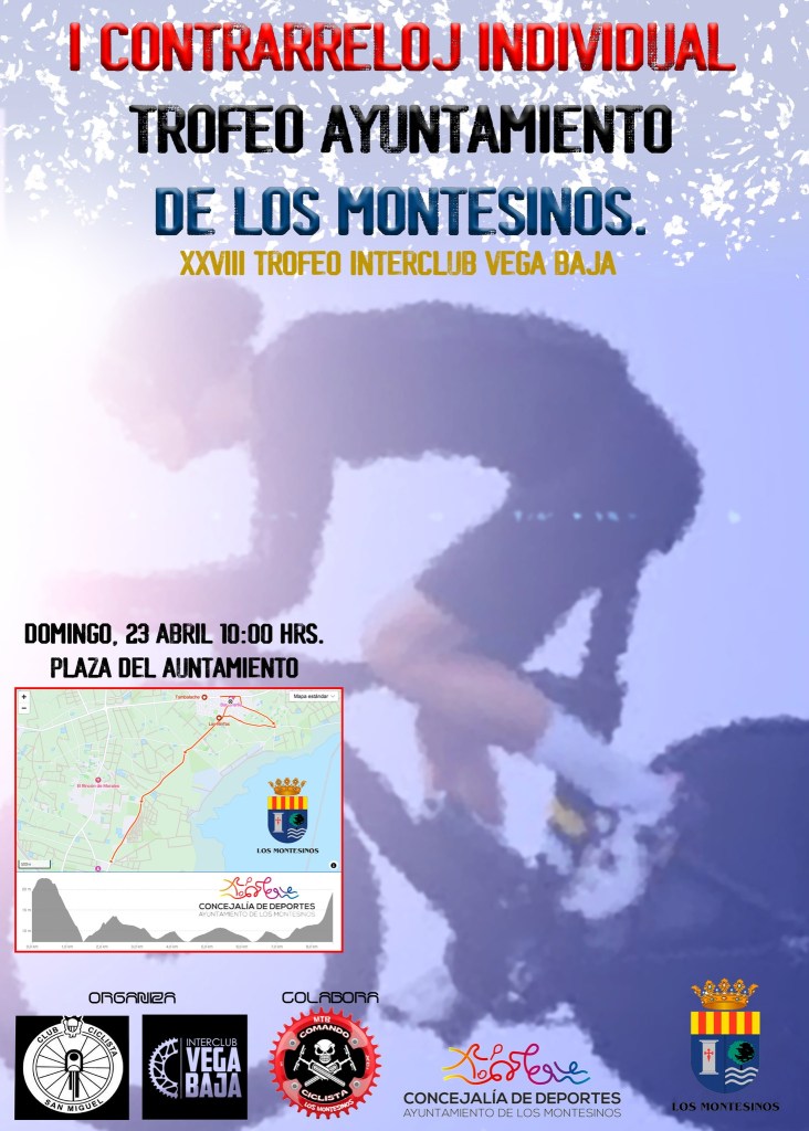 El viernes, día 31 de marzo, a partir de las 13.00 horas se realizará la presentación, en el Ayuntamiento de Los Montesinos, de la que será la primera etapa que abre el XXVIII Trofeo Interclubs Vega Baja 2023. Una contrarreloj individual que servirá para vestir al primer líder del citado Torneo el próximo 23 de abril. El resto de carreras se disputarán en Benferri (29 de abril), Pilar de Horadada (7 de mayo), San Miguel de Salinas (13 de mayo), Catral (3 de junio), Torrevieja (11 de junio), Crevillent (24 de junio), Albatera (2 de julio), Granja-Cox (9 de julio) y Almoradí (23 de julio). Son diez pruebas intensas en la que los ciclistas lucharán por coger el relevo a Moisés Espinós (Mister Biker), que conquistó en 2022 la general.