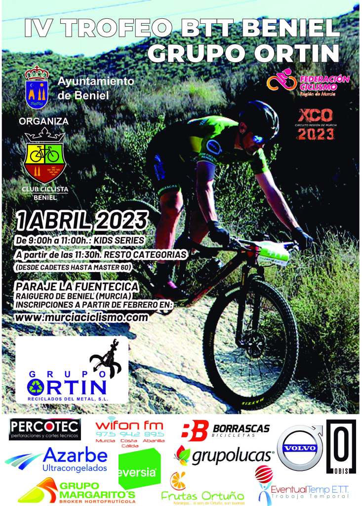 Este sábado, día 1 de abril, se disputa la cuarta edición del Trofeo de Ciclismo «BTT Beniel – Grupo Ortin», puntuable para el calendario XCO de la Región de Murcia. El paraje natural de «La Fuentecica», ubicado en la pedanía de El Raiguero, acogerá un año más este importante evento deportivo, organizado por el Club Ciclista de Beniel. El recorrido tiene un marcado carácter técnico, con una longitud de hasta cinco kilómetros y 140 metros de desnivel en cada vuelta. A las nueve de la mañana arrancarán las series infantiles y a partir de las once y media el resto de categorías, desde cadetes hasta máster 60.