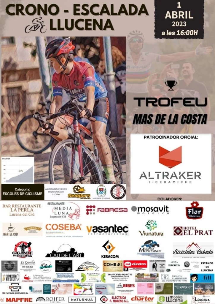 El sábado, día 1 de abril, las Escuelas de València tienen un cita en Lliria, a partir de las 17 horas con la disputa de una prueba organizada por la Peña Ciclista Pedal, mientras que Llucena del Cid, con inicio a las cuatro de la tarde, ofrecerá una inédita cronoescalada para estas categorías. Es la primera lucha contra las manecillas del reloj en ascenso, en la Comunidad Valenciana en categoría de escuelas con motivo del primer Trofeo Más de la Costa en la población castellonense, organizado por el Club Ciclista Senglars del Monte. Esta competición, que aparece por primera vez en el calendario provincial, ascenderá por las calles empinadas de Llucena con una media de 4’4 por ciento, pasando de los 500 a los 700 metros en la línea de meta, tras cubrir un kilómetro de recorrido, aunque los Promesas realizaran unos 600 metros. Cabe resaltar que los organizadores habilitarán una rampa en la salida como se encuentra en cualquier vuelta de profesionales para que sea todo un atractivo para esta carrera que se presenta muy interesante.