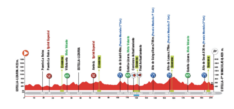 El GP Miguel Indurain se disputa a partir de las 12 horas sobre un recorrido con un encadenado de subidas alrededor de Estella como dinamizador de un recorrido que supera los 200 kilómetros. El Alto de Guirguillano (1ª Cat.), el Alto de Lezaun (2ª Cat.) y el doble ascenso al Alto de Eraul (2ª Cat.) irán acompañados por tres pasos no puntuables Muru e Ibarra, el último a apenas 1,5 kilómetros de meta.