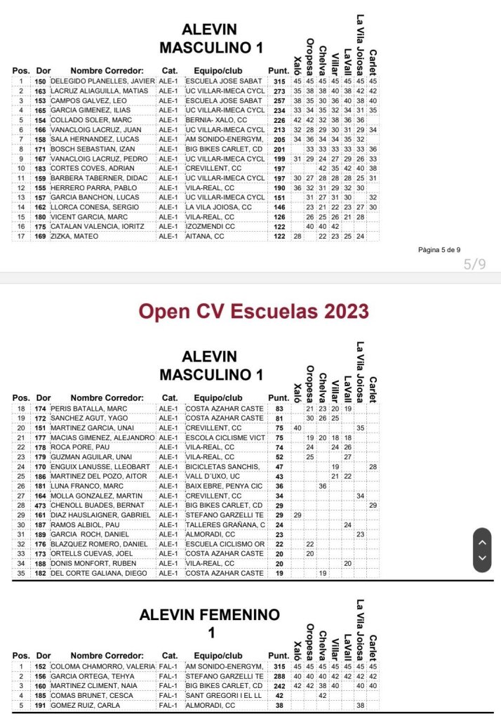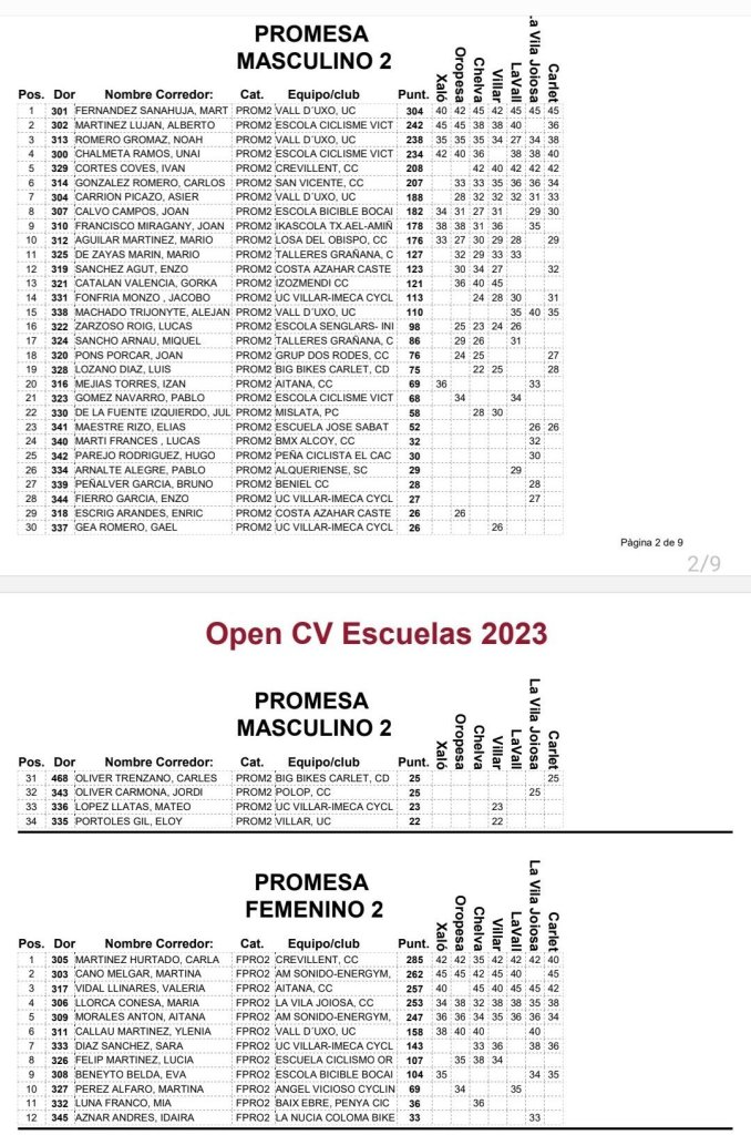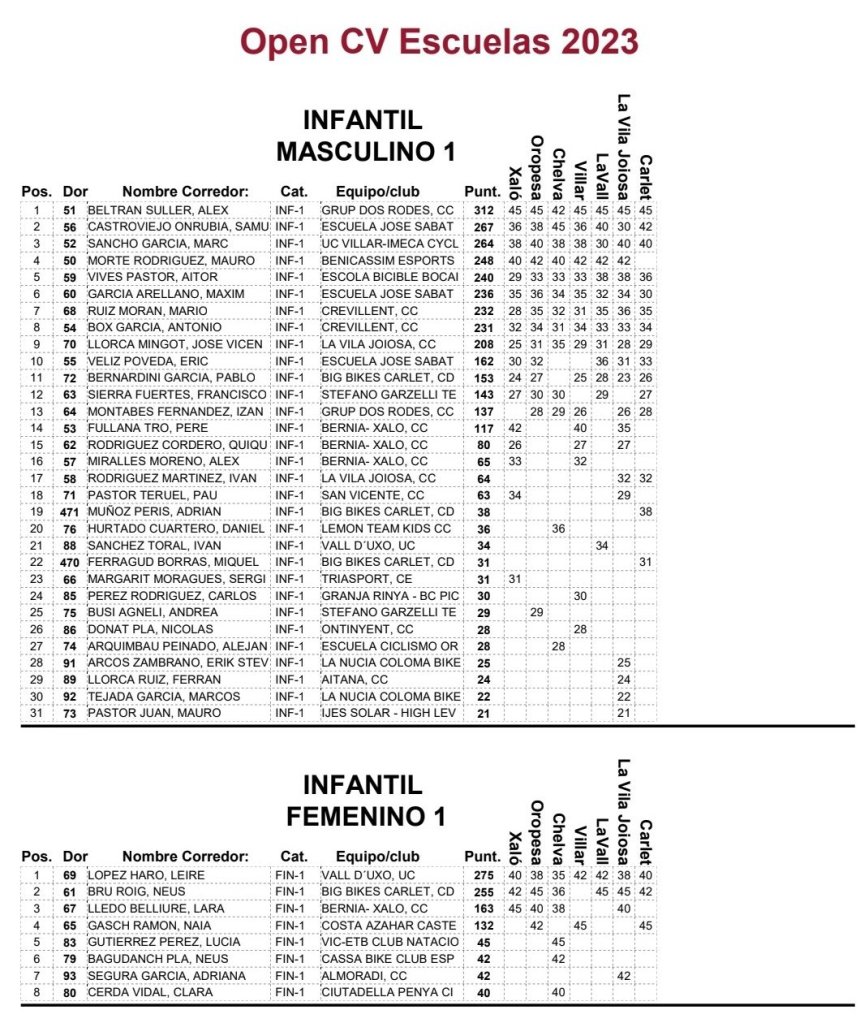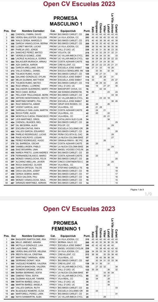 El I Open Escola Big Bikes Carlet, séptima prueba puntuable del Open Btt Xco Comunitat Valenciana de Escuelas, ha dejado asi la clasificación general del Torneo: Iria Baquero (La Vila) y David Chenoll (Big Bikes) son los primeros en Promesas 1; Martín Fernández (Vall d’Uixó) y Carla Martínez (Crevillent), en Promesas 2; Álex Moreno (UC Villar) y Elia Galindo (AM Sonido), en Principiantes 1; Iker Hiraldo (Sabater) y Vega Morales (AM Sonido), en Principiantes 2; Javier Delegido (Sabater) y Valeria Coloma (AM Sonido), en Alevines 1; Gonzalo Muñoz (Sabater) y Ainhoa Cano (AM Sonido), en Alevines 2; Álex Beltrán (Grup Dos Rodes) y Leire López (Vall ‘Uixó) en Infantiles 1; Pablo Picazo (Sabater) y Carolina Casares (Vall d’Uixó), en Infantiles 2.