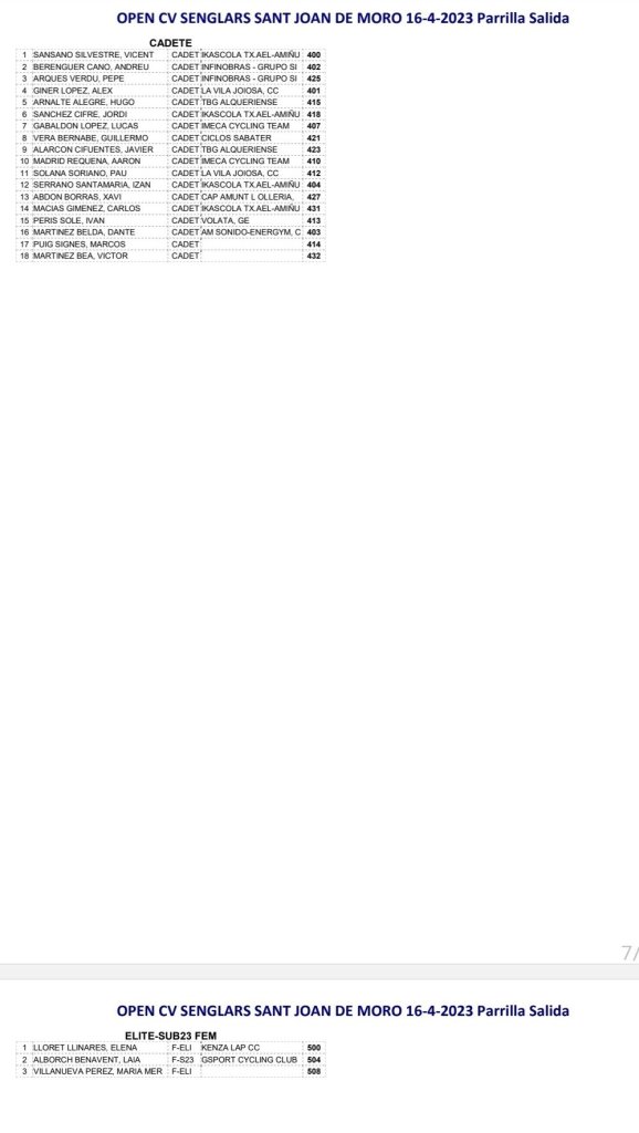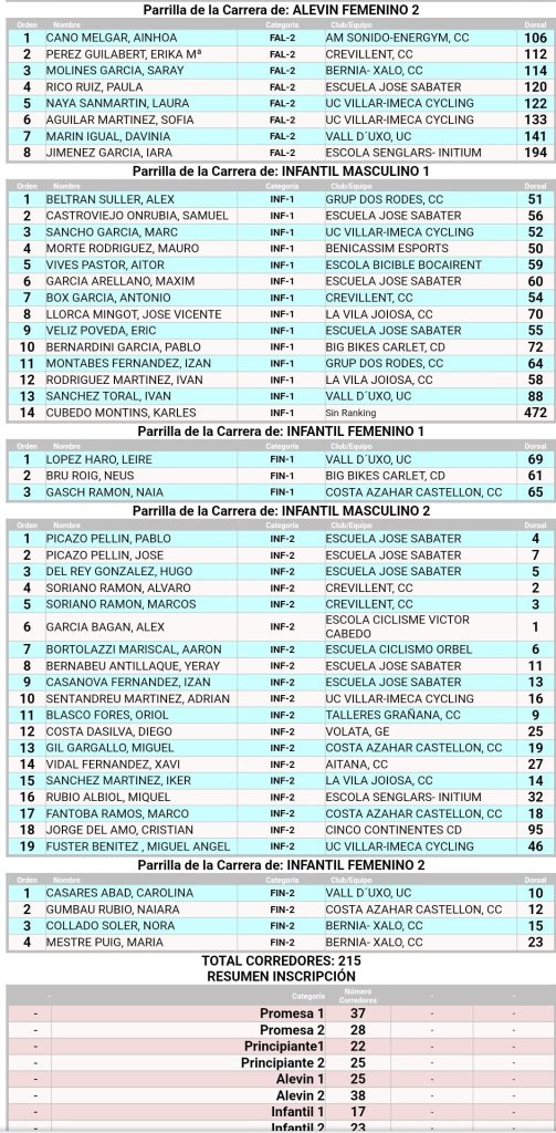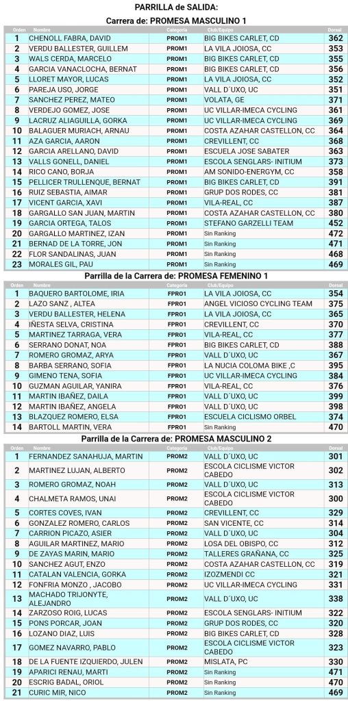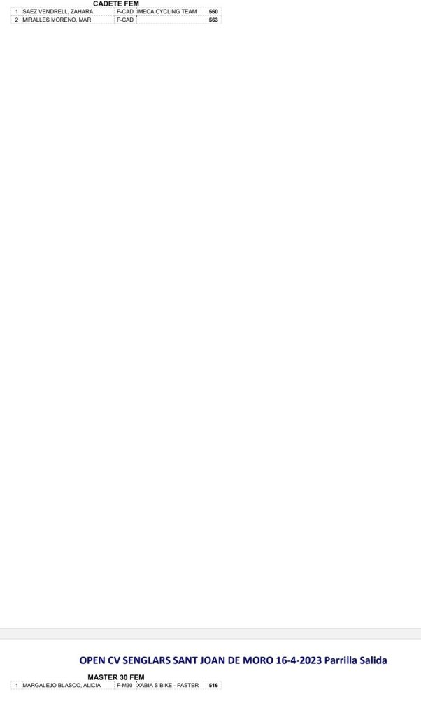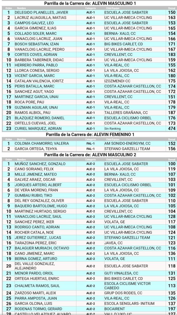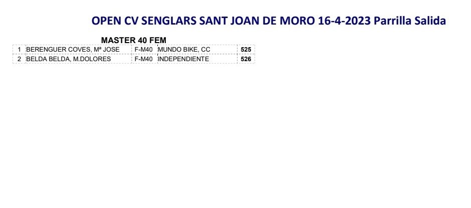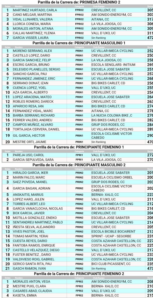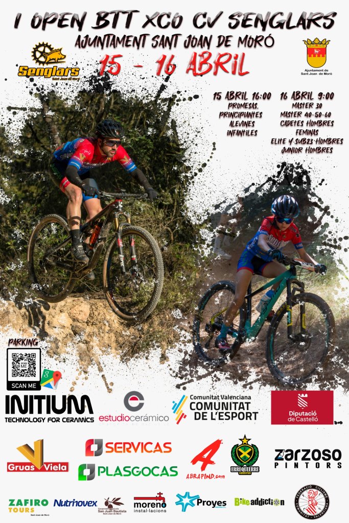 Doble ración de BTT este fin de semana. El Open BTT-XCO CV Senglars Ajuntament Sant Joan de Moró comienza el sábado, día 15, a las 16 horas, con la prueba de Escuelas. Será la octava de la temporada. El Open Btt Xco Comunitat Valenciana de Escuelas tiene así la clasificación general: Iria Baquero (La Vila) y David Chenoll (Big Bikes) son los primeros en Promesas 1; Martín Fernández (Vall d’Uixó) y Carla Martínez (Crevillent), en Promesas 2; Álex Moreno (UC Villar) y Elia Galindo (AM Sonido), en Principiantes 1; Iker Hiraldo (Sabater) y Vega Morales (AM Sonido), en Principiantes 2; Javier Delegido (Sabater) y Valeria Coloma (AM Sonido), en Alevines 1; Gonzalo Muñoz (Sabater) y Ainhoa Cano (AM Sonido), en Alevines 2; Álex Beltrán (Grup Dos Rodes) y Leire López (Vall ‘Uixó) en Infantiles 1; Pablo Picazo (Sabater) y Carolina Casares (Vall d’Uixó), en Infantiles 2.