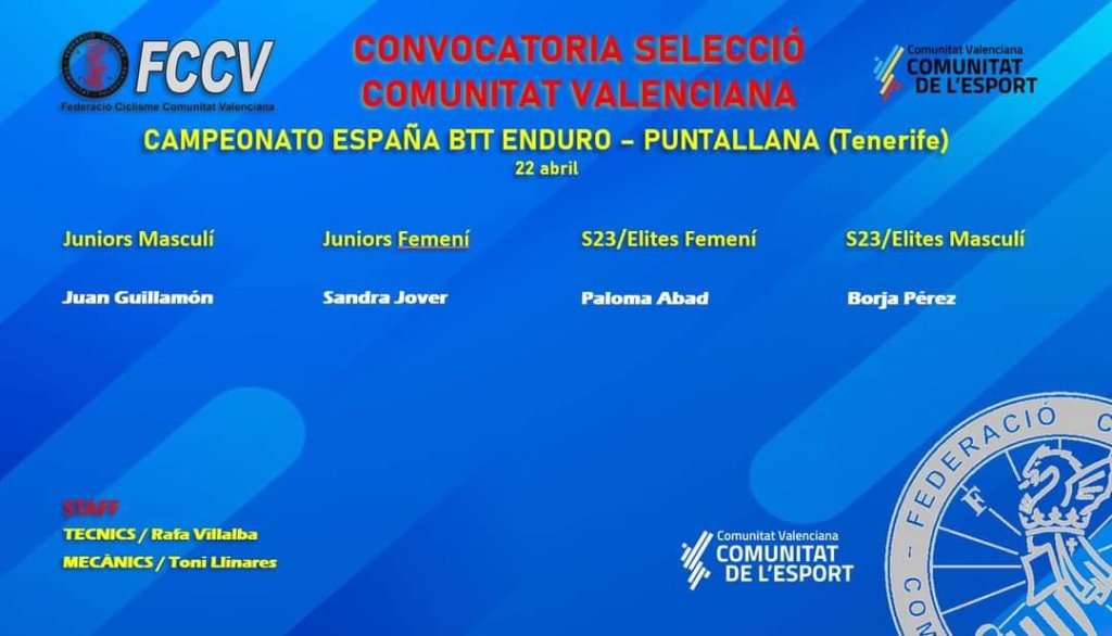 El seleccionador de BTT de la FCCV, Rafa Villalba, ha dado a conocer esta mañana los seleccionados para ir al Campeonato de España de BTT Enduro que se celebra el próximo 22 de abril en Puntallana, Tenerife.