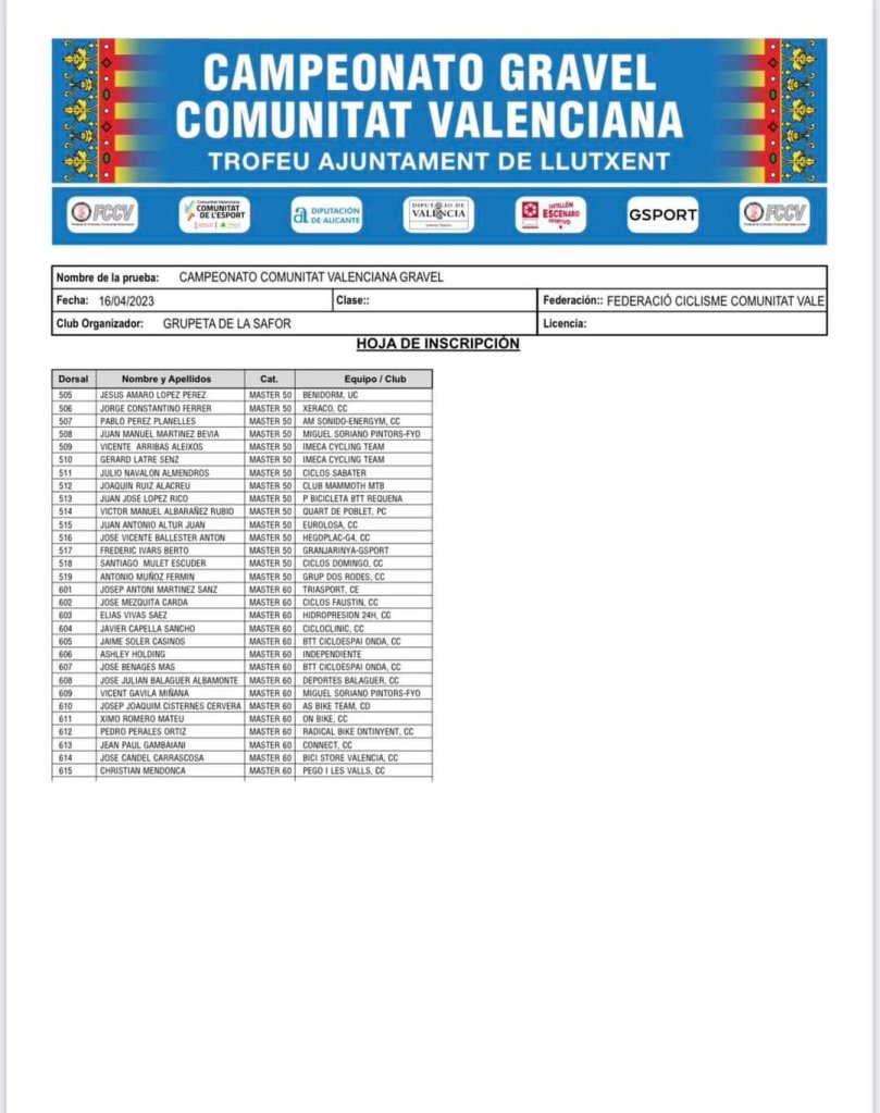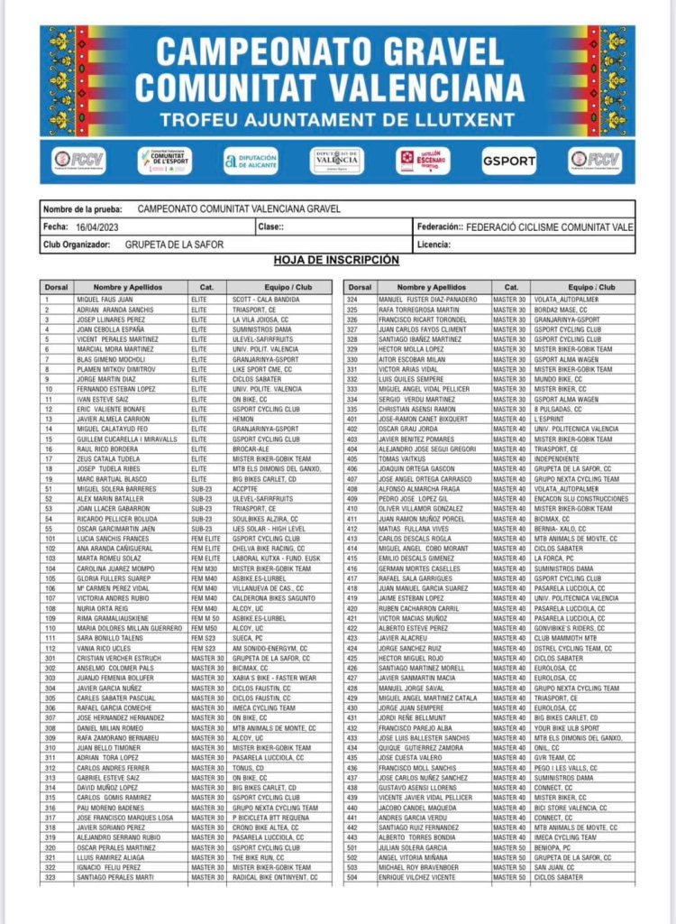 Llutxent acogerá el domingo, día 16 de abril, el Campeonato Autonómico de Gravel. Lista de inscritos .