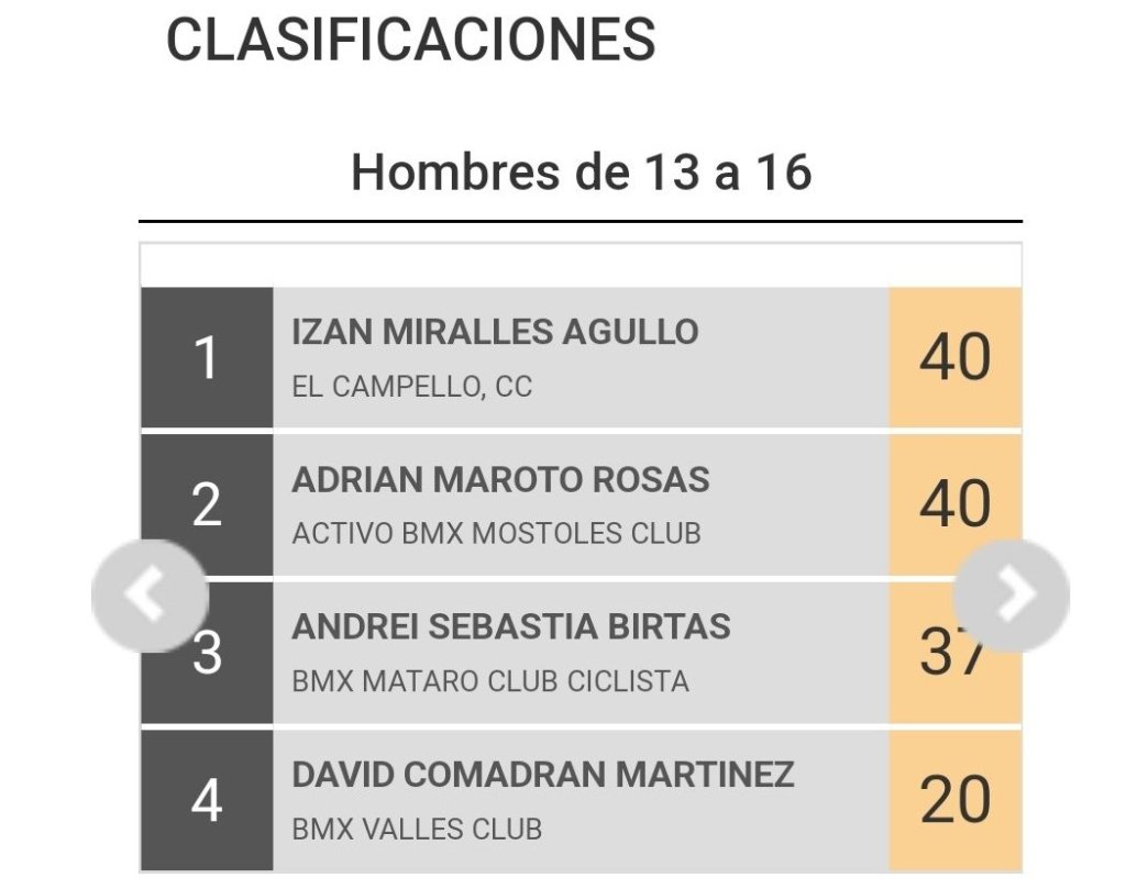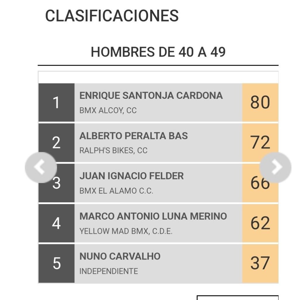 Los riders alicantinos estarán en la competición luchando por los primeros puestos. Lista de inscritos. Izán Miralles (BMX El Campello) lidera la clasificación Hombres de 13 a 16 y Enrique Santonja (BMX Alcoy), en Hombres de 40 a 49. Clasificaciones