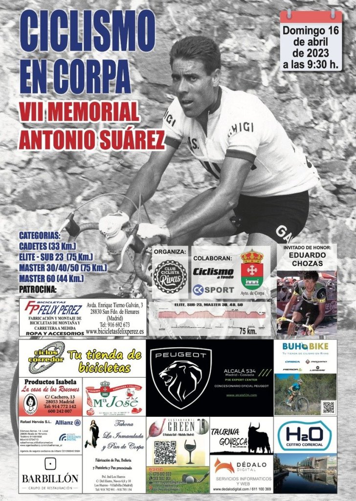 El próximo domingo, día 16 de abril, la localidad de Corpa se vestirá de gala para la puesta en marcha del VII Memorial Antonio Suárez. Prueba que homenajea a su ciclista más emblemático bajo la organización del Club Ciclista Rivas en colaboración con el Ayuntamiento del municipio, Ciclismo a Fondo y CK Sport. Asimismo, tendrá como invitado de honor al ex-ciclista Eduardo Chozas. En la carrera, tomarán parte las categorías Cadetes, Elites-sub23 y Máster y debutará con el maillot del Avimosa Chozas Team Antonio Baile. El ciclista de Santa Pola comienza de nuevo una temporada que tendrá la próxima parada en la CRI de Los Montesinos con la que comenzará el próximo 23 de abril el XXVIII Trofeo Interclub Vega Baja.