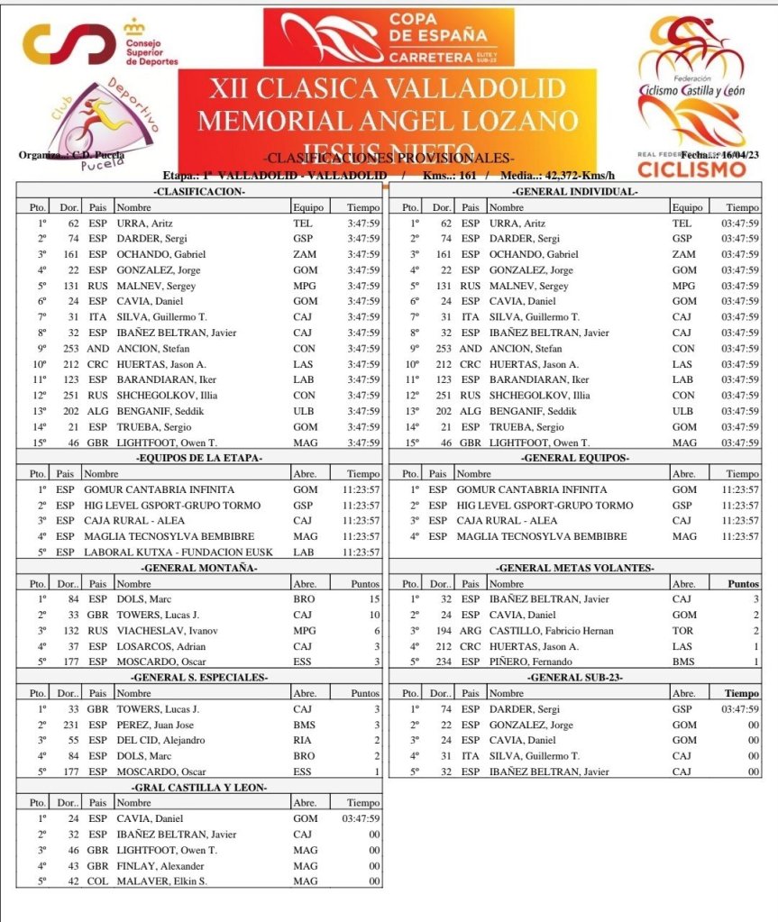 La Copa de España Élite-Sub23 ha llegado hoy a su ecuador con la ajustada victoria al sprint de Aritz Urra (Telco On. Clima Osés) en la Clásica de Valladolid-Memorial Ángel Lozano por delante de Sergi Darder (High Level) y Gabriel Ochando (Zamora Enamora). Thomas Silva ha mostrado de nuevo una enorme solidez para concluir en séptima posición y mantener así su liderato del certamen nacional. Marc Dolçs (Brocar Alé), que ha sido protagonista de la escapada de la jornada, se ha vestido con el maillot de la montaña.