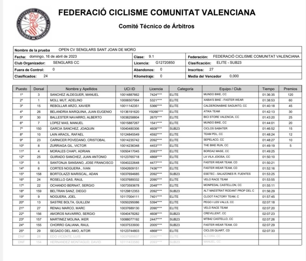 En M30, la victoria ha sido para Felipe Barea (Atika) y Alicia Margalejo (Xabia’s Bike); Ivan Díaz (Bicimax) y María José Berenguer (Mundobike), en M40; José Cabello (Feelyourbike), en M50; y Agustí Millán (Ciclesxtrem), en M60.