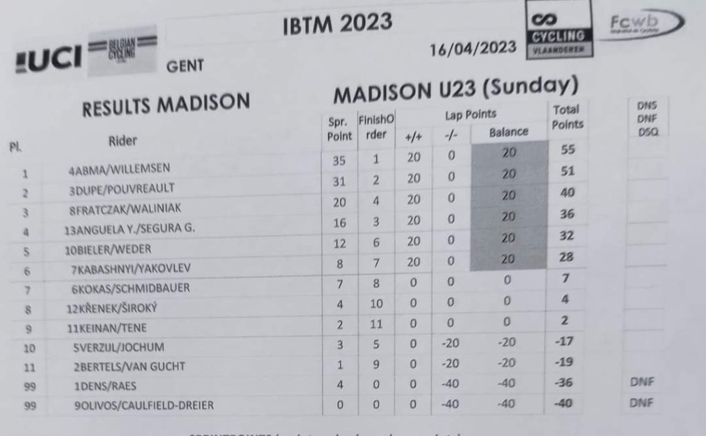 José Segura y Mario Anguela rozaron el podio en la Madison sub 23 al finalizar cuartos, a solo cuatro puntos de los terceros clasificados, en la última jornada del Belgian Track Meeting de Gante. La pareja española sumó 36 por los 40 de los polacos Radosław Frątczak y Konrad Waliniak.