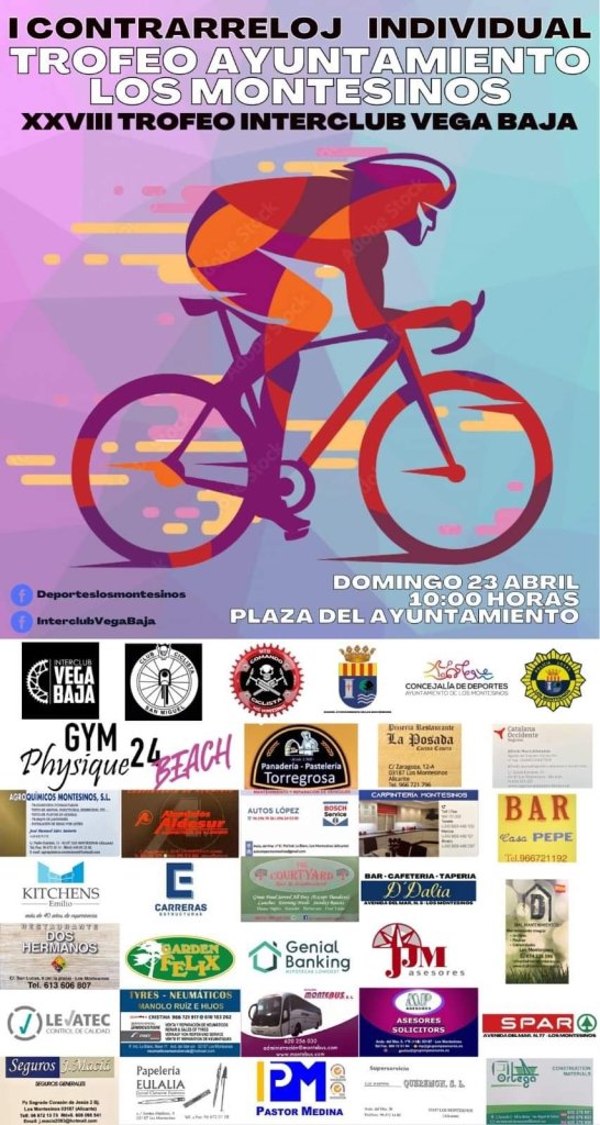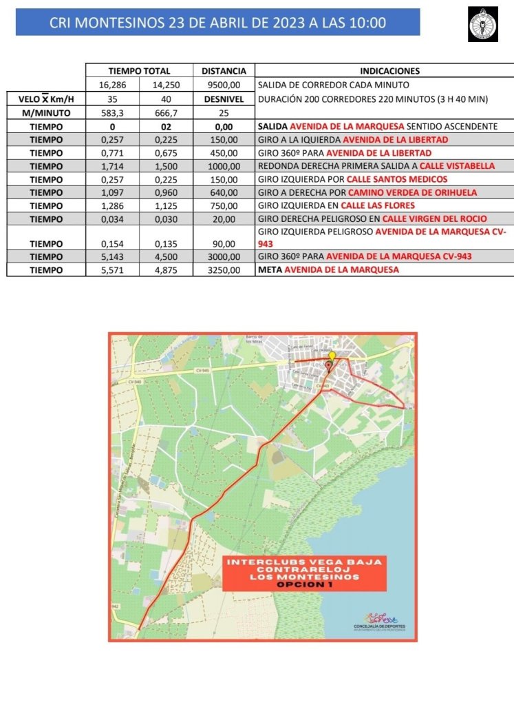 El XXVIII Trofeo Interclubs Vega Baja 2023 se inicia el domingo, día 23 de abril, a partir de las 10 horas. Una contrarreloj individual en Los Montesinos de 9 kilómetros servirá para vestir al primer líder del citado Torneo. Se desarrollará por un circuito semi-urbano que discurrirá en su gran mayoría por la carretera de la Marquesa en Los Montesinos.