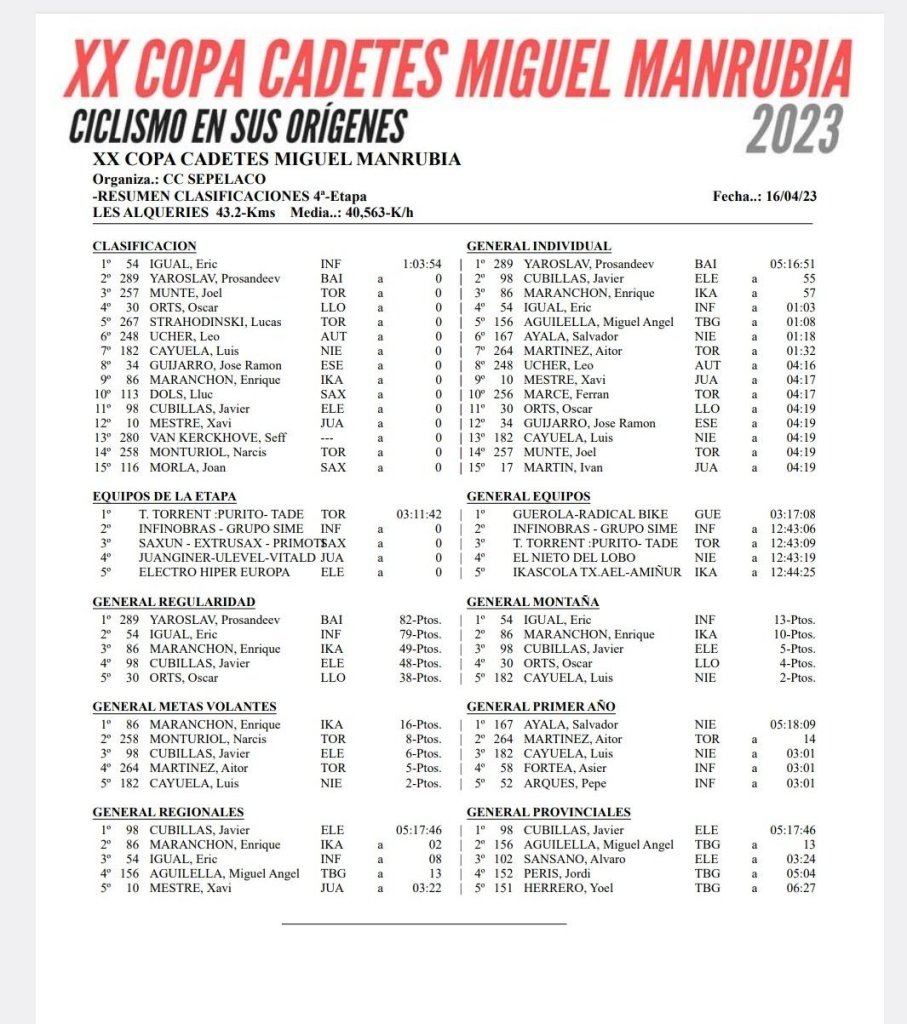 Este fin de semana se pone el punto final a la Copa Cadete Miguel Manrubia. La competición disputará las carreras del Memorial Jaime Pelegrí en Betxí y el Trofeo Ayuntamiento de Castellnovo que pondrá el broche de la competición con casi 1 minuto de renta del líder Prosandeev Yaroslav sobre sus adversarios y únicamente siete ciclistas con una diferencia salvable, de 1 minuto y 30 segundos perdidos con respecto al ruso.