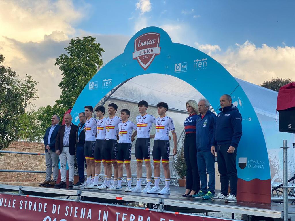 La Selección Española júnior masculina de carretera ha superado de forma notable la primera jornada de la Due Giorni Eroica, segunda prueba de la Copa de las Naciones de carretera 2023, que comprendía un doble parcial compuesto por una contrarreloj por equipos matinal y una prueba en línea llana vespertina de algo más de 70 km.