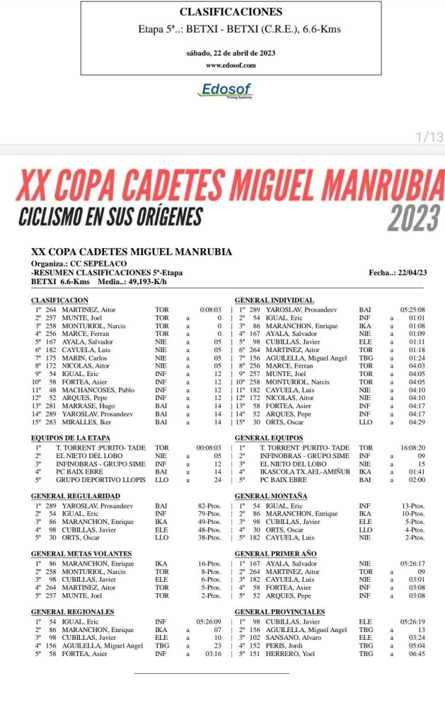 Etapa 5. CRI. Memorial Jaime Pelegrí en Betxi. Clasificaciones