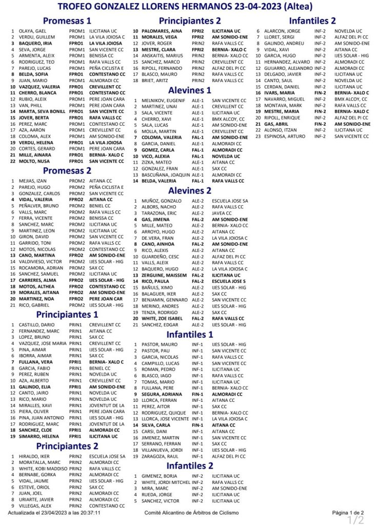 Gael Olaya (UC Ilicitana) e Iria Baquero (La Vila) han sido los ganadores en Promesas 1; Izán Mejías (Aitana) y Martina Cano (AM Sonido), en Promesas 2; Darío Castillo (Crevillente) y Vera Fullana (Bernia Xaló), en Principiantes 1; Iker Hiraldo (Sabater) y Aina Palomares (UC Ilicitana), en Principiantes 2; Eugeni Melnikov (San Vicente) y Valeria Coloma (AM Sonido), en Alevines 1; Gonzalo Muñoz (Sabater) y Jimena Gas (AM Sonido), en Alevines 2; Mauro Pastor(Ijes Solar) y Adriana Segura (Almoradí), en Infantiles 1; y Borja Jiménez (UC Ilicitana) y María Ivars (Bernia Xaló), en Infantiles 2.