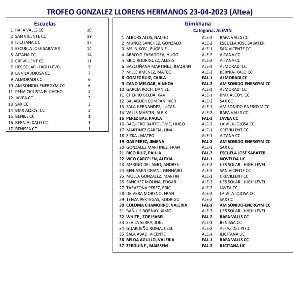 La Escuela del Club Ciclista Rafa Valls se ha impuesto hoy en el Trofeo González Llorens-Hermanos Construcciones disputado en la Avenida Comunidad Valenciana de Altea. La tercera prueba de la Challenge de Escuelas Alicante ha estado organizada por el Club Ciclista Pere Joan Caragol. El CC San Vicente ha finalizado segundo y la Unión Ciclista Ilicitana, tercera. Destacar el debut de Miguel Juan como director de la recién creada escuelas del CC Pere Joan Caragol.