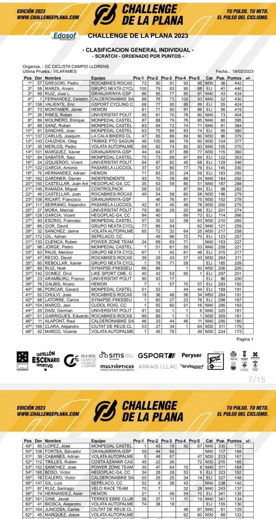 La Challenge de la Plana llega este fin de semana a su fin con una doble jornada en Eslida. El sábado se disputa una jornada de 70 kilómetros. La salida será a las 15.30 horas. Y, el domingo, la etapa final terminará en el puerto del Eslida, tras 60 kilómetros. La salida a las 10.40 horas. Pedro Gregori (Rocabikes Roca) afronta esta recta final de la Challenge como líder, con Álvaro Marza (Grupo Nexta), segundo, y, José Luis Ruiz (Granja Rinya), tercero.
