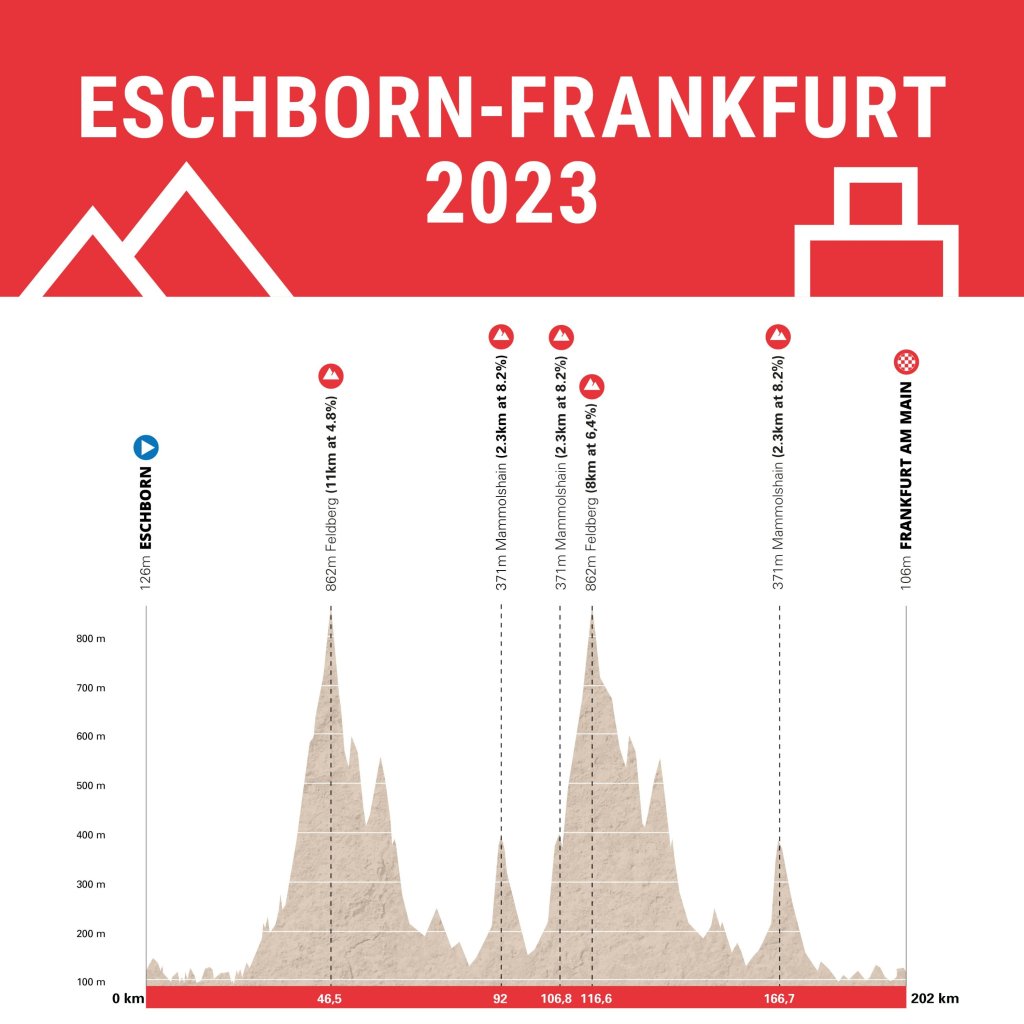 Como es tradicional, la competición unirá las localidades de Eschborn y Frankfurt tras 200 kilómetros de recorrido. Una cita del máximo nivel que generalmente se decide en una volata, otorgando el triunfo a un corredor rápido. Sin embargo, el pelotón suele perder unidades en las diferentes subidas de la carrera. Los corredores morados deberán ascender en dos ocasiones el Feldberg y en tres, el Mammolshain.