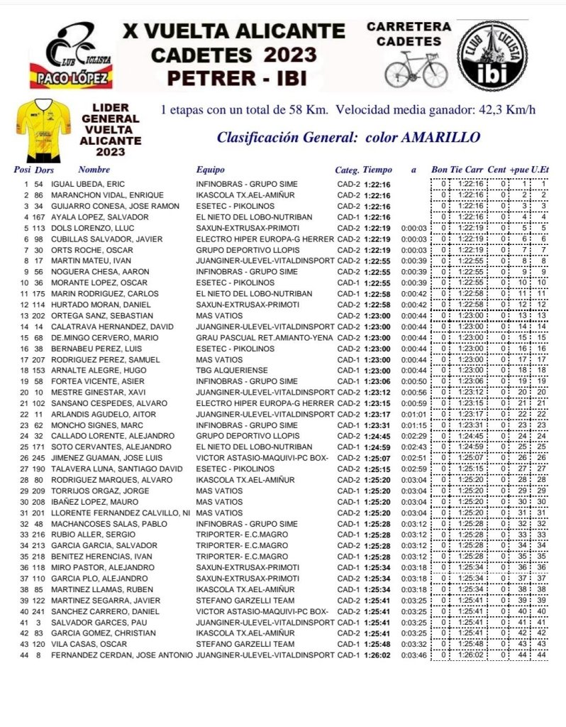 Eric Igual (Infinobras) se ha impuesto esta tarde en la primera etapa de la Challenge Vuelta Alicante Cadetes que se ha disputado sobre una distancia de 44 kilómetros y ha unido Petrer con el alto de la Casa Forestal en la localidad alicantina. Enrique Maranchón (Ikascola) ha sido segundo y José Ramón Guijarro (Esetec Pikolinos), tercero. Siete corredores han llegado en solitario a meta y en pleno esprint Óscar Orts (GD Llopis) se ha ido al suelo y ha entrado en meta séptimo con la bicicleta en la mano y le han picado tres segundos.