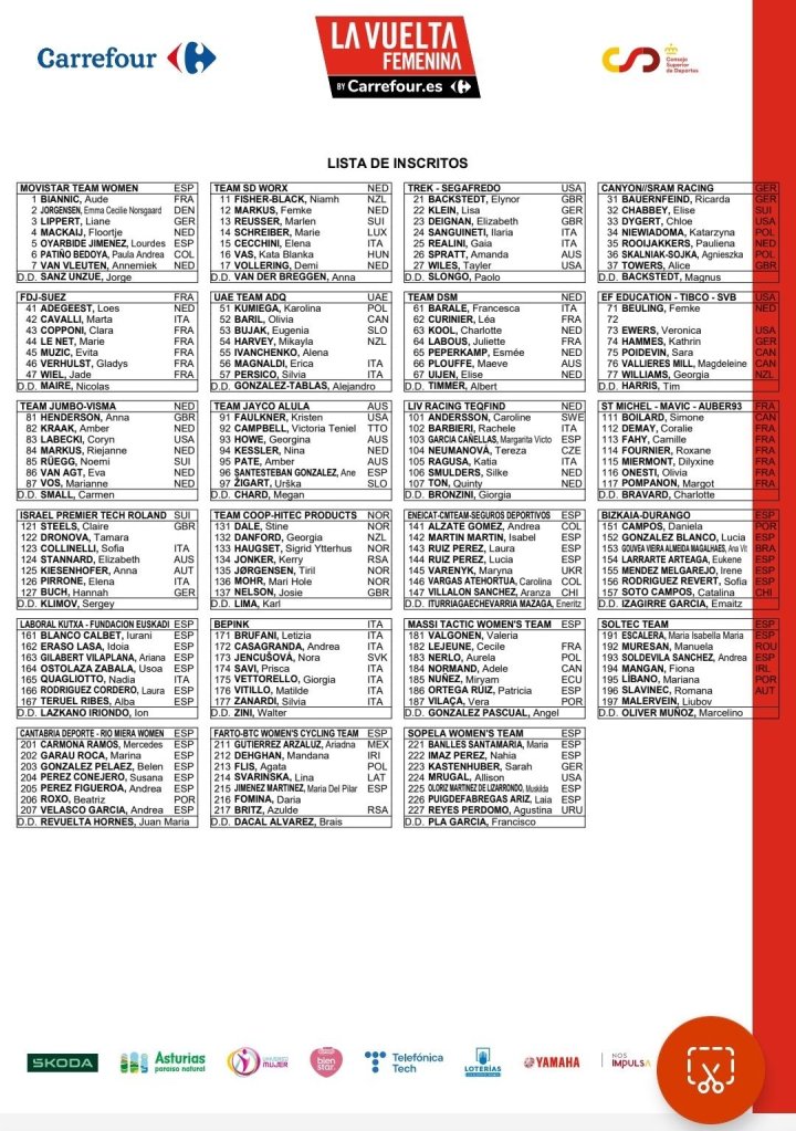 En un pelotón que tendrá una media de edad de 25,8 años, solamente la navarra Muskilda Oloriz (Sopela Women’s Team, con 41 años y 39 días) supera en edad a la defensora del título, una Annemiek Van Vleuten (Movistar Team) que luchará de nuevo por la victoria, además como vigente campeona del mundo, con 40 años y 205 días. Por otro lado, la ciclista italiana Andrea Casagranda (Bepink) será la ciclista más joven de La Vuelta Femenina by Carrefour.es, con 18 años y 221 días, seguida de muy cerca por Laia Puigdefábregas y Nahia Imaz (Sopela Women’s Team) y las mellizas Laura y Lucía Ruiz Pérez (Eneicat-CM Team-Seguros Deportivos), todas ellas con los 19 años todavía sin cumplir, que vivirán su primera gran vuelta ante muchas de las mejores ciclistas del mundo.
