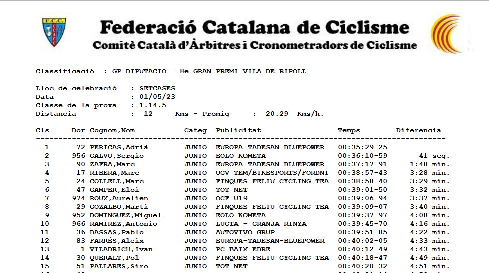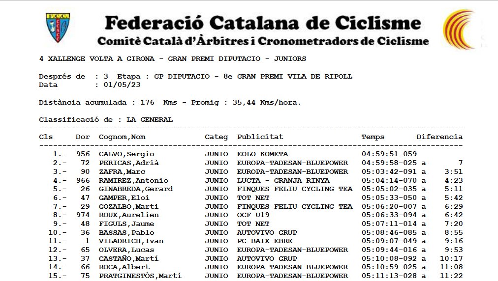 Sergio Calvo (Eolo Kometa) se ha adjudicado la Volta a Girona para corredores júniors tras la disputa hoy de la tercera etapa, una CRI en la que Adrià Pericas (Europa Tadesan), ha sido el ganador. En la crono el campeón de Cataluña detuvo el reloj en los 35’29”. A 41 segundos, único ciclista capaz de quedarse a menos de un minuto, concluyó Sergio Calvo. Pericas ha sido segundo en la general, su compañero de escuadra Marc Zafra, tercero, y el corredor del Lucta-Granja Rinya, Antonio Ramírez ha sido cuarto. Gran regularidad la suya en los tres días. Fue tercero en la primera jornada y décimo en las dos siguientes. «He tenido buenas sensaciones los 3 días, siempre intentándolo, aunque hoy en la crono a pesar de no tener las mejores sensaciones he perdido el podium y los demás me han metido mucho tiempo», ha reconocido Ramírez.